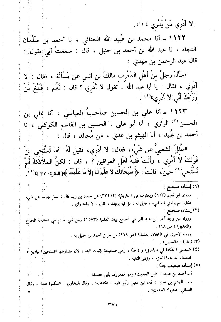 أنا مُحَمَّدُ بْنُ عُبَيْدِ اللَّهِ الْحِنَّائِيُّ , نا أَحْمَدُ بْنُ سَلْمَانَ النِّجَادُ , نا عَبْدُ اللَّهِ بْنُ أَحْمَدَ بْنِ حَنْبَلٍ , قَالَ: سَمِعْتُ أَبِي يَقُولُ: قَالَ عَبْدُ الرَّحْمَنِ بْنُ مَهْدِيٍّ: سَأَلَ رَجُلٌ مِنْ أَهْلِ الْمَغْرِبِ مَالِكَ بْنَ أَنَسٍ عَنْ مَسْأَلَةٍ , فَقَالَ: «لَا أَدْرِي» , فَقَالَ: يَا أَبَا عَبْدِ اللَّهِ: تَقُولُ لَا أَدْرِي؟ قَالَ: «نَعَمْ , فَبَلِّغُ مَنْ وَرَاءَكَ أَنِّي لَا أَدْرِي»