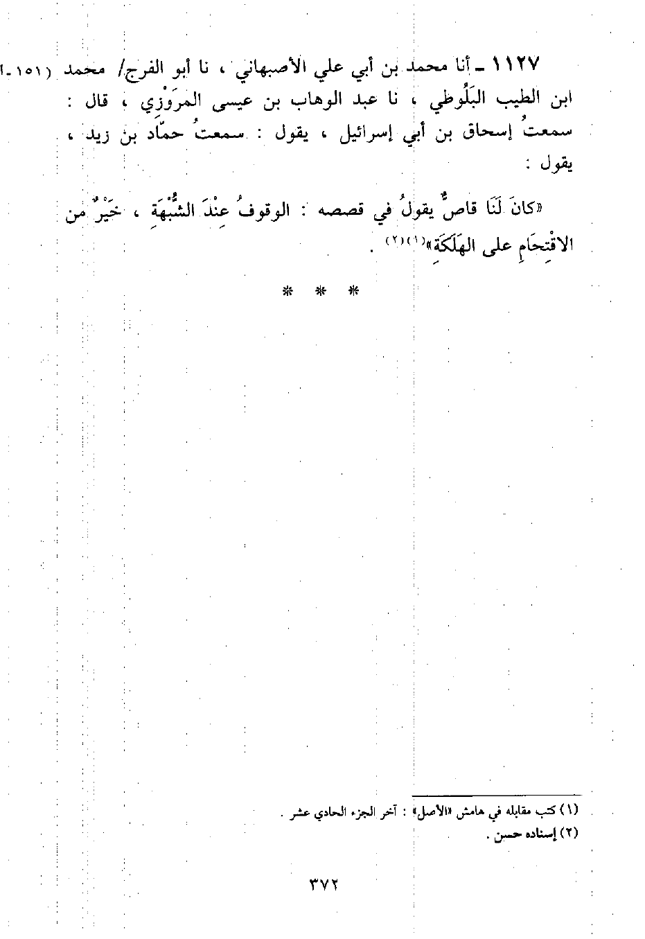 أنا مُحَمَّدُ بْنُ أَبِي عَلِيٍّ الْأَصْبَهَانِيُّ , نا أَبُو الْفَرَجِ مُحَمَّدُ بْنُ الطَّيِّبِ الْبَلُّوطِيُّ , نا عَبْدُ الْوَهَّابِ بْنُ عِيسَى الْمَرْوَزِيُّ , قَالَ: سَمِعْتُ إِسْحَاقَ بْنَ أَبِي إِسْرَائِيلَ , يَقُولُ: سَمِعْتُ حَمَّادَ بْنَ زَيْدٍ , يَقُولُ: " كَانَ لَنَا قَاصٌّ يَقُولُ فِي قَصَصِهِ: الْوقُوفُ عِنْدَ الشُّبْهَةِ , خَيْرٌ مِنَ الِاقْتِحَامِ عَلَى الْهَلَكَةِ "
