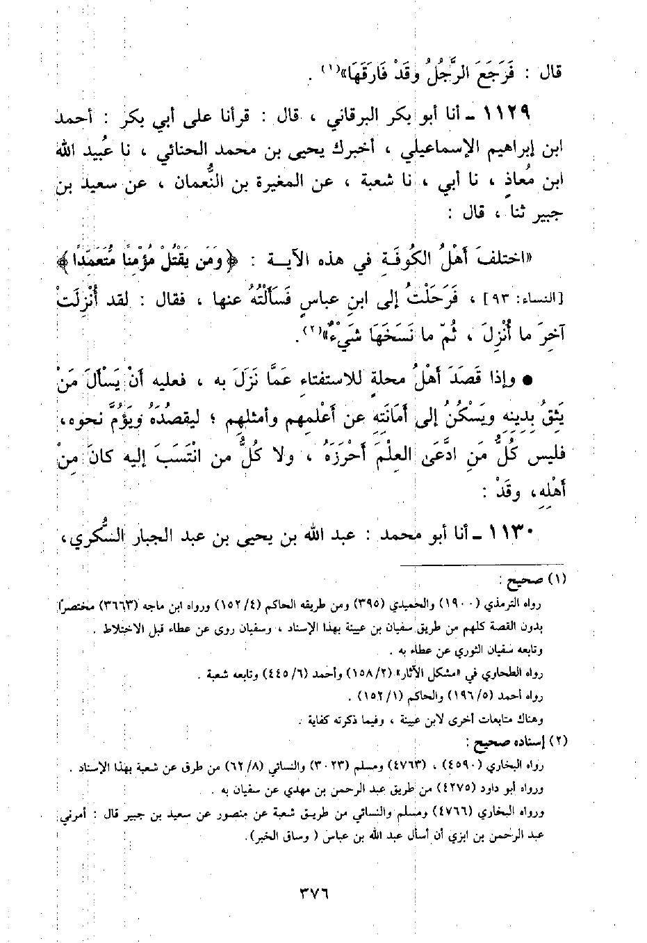 أنا أَبُو بَكْرٍ الْبَرْقَانِيُّ , قَالَ: قَرَأْنَا عَلَى أَبِي بَكْرٍ أَحْمَدَ بْنِ إِبْرَاهِيمَ الْإِسْمَاعِيلِيِّ , أَخْبَرَكَ يَحْيَى بْنُ مُحَمَّدٍ الْحِنَّائِيُّ , نا عُبَيْدُ اللَّهِ بْنُ مُعَاذٍ , نا أَبِي , نا شُعْبَةُ , عَنِ الْمُغِيرَةِ بْنِ النُّعْمَانِ , عَنْ سَعِيدِ بْنِ جُبَيْرٍ , ثَنَا قَالَ: اخْتَلَفَ أَهْلُ الْكُوفَةِ فِي هَذِهِ الْآيَةِ: {وَمَنْ يَقْتُلْ مُؤْمِنًا مُتَعَمِّدًا} [النساء: ٩٣] , فَرَحَلْتُ إِلَى ابْنِ عَبَّاسٍ فَسَأَلْتُهُ عَنْهَا , فَقَالَ: «لَقَدْ أُنْزِلَتْ آخِرَ مَا أُنْزِلَ , ثُمَّ مَا نَسَخَهَا شَيْءٌ» وَإِذَا قَصَدَ أَهْلَ مَحِلَّةٌ لِلْاسْتِفْتَاءِ عَمَّا نَزَلَ بِهِ , فَعَلَيْهِ أَنْ يَسْأَلَ مَنْ يَثِقُ بِدِينِهِ وَيَسْكُنُ إِلَى أَمَانَتِهِ عَنْ أَعْلَمِهِمْ وَأَمْثَلِهِمْ , لِيَقْصِدَهُ وَيَؤُمَّ نَحْوَهُ , فَلَيْسَ كُلُّ مَنِ ادَّعَى الْعِلْمَ أَحْرَزَهُ , وَلَا كُلُّ مَنِ انْتَسَبَ إِلَيْهِ كَانَ مِنْ أَهْلِهِ
