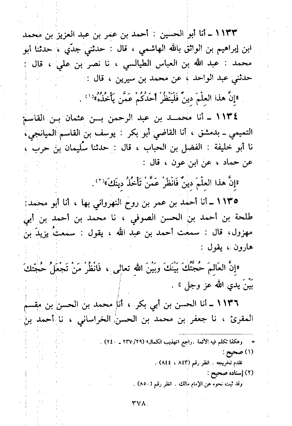 أنا مُحَمَّدُ بْنُ عَبْدِ الرَّحْمَنِ بْنِ عُثْمَانَ بْنِ الْقَاسِمِ التَّمِيمِيُّ , بِدِمَشْقَ , أنا الْقَاضِي أَبُو بَكْرٍ يُوسُفُ بْنُ الْقَاسِمِ الْمَيَانِجِيُّ , نا أَبُو خَلِيفَةَ الْفَضْلُ بْنُ الْحُبَابِ , قَالَ: حَدَّثَنَا سُلَيْمَانُ بْنُ حَرْبٍ , عَنْ حَمَّادٍ , عَنِ ابْنِ عَوْنٍ , قَالَ: «إِنَّ هَذَا الْعِلْمَ دِينٌ فَانْظُرْ عَمَّنْ تَأْخُذُ دِينَكَ»