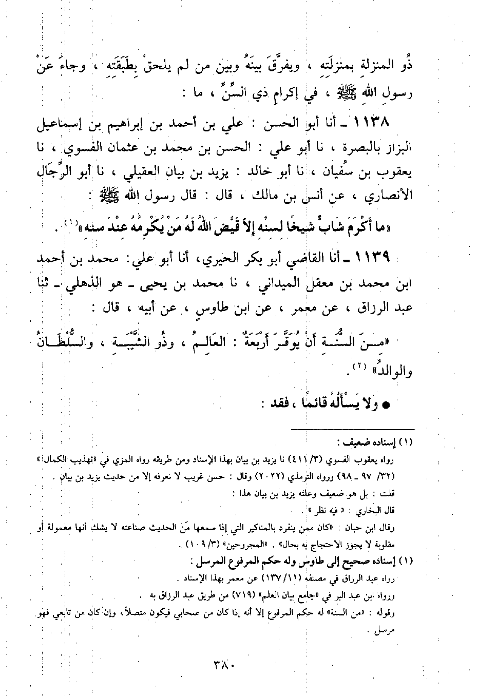 أنا الْقَاضِي أَبُو بَكْرٍ الْحِيرِيُّ , أنا أَبُو عَلِيٍّ مُحَمَّدُ بْنُ أَحْمَدَ بْنِ مُحَمَّدِ بْنِ مَعْقِلٍ الْمَيْدَانِيُّ , نا مُحَمَّدُ بْنُ يَحْيَى هُوَ الذُّهْلِيُّ , ثَنَا عَبْدُ الرَّزَّاقِ , عَنْ مَعْمَرٍ , عَنِ ابْنِ طَاوُسٍ , عَنْ أَبِيهِ , قَالَ: " مِنَ السُّنَّةِ أَنْ يُوَقَّرَ , أَرْبَعَةٌ: الْعَالِمُ , وَذُو الشَّيْبَةِ , وَالسُّلْطَانُ وَالْوَالِدُ "