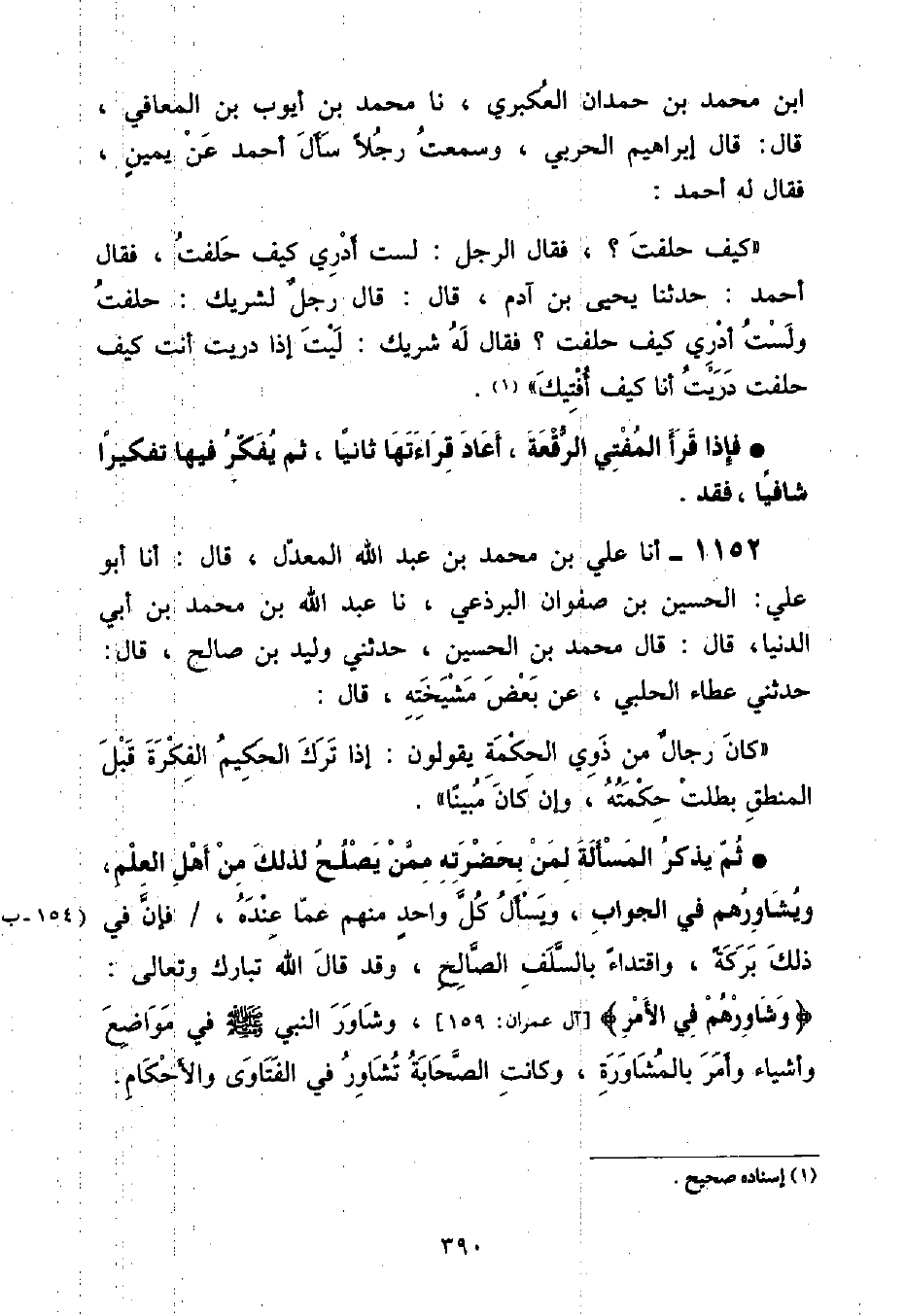 فَإِذَا قَرَأَ الْمُفْتِي الرُّقْعَةَ , أَعَادَ قِرَاءَتَهَا ثَانِيًا , ثُمَّ يُفَكِّرُ فِيهَا تَفْكِيرًا شَافِيًا , فَقَدْ: أنا عَلِيُّ بْنُ مُحَمَّدِ بْنِ عَبْدِ اللَّهِ الْمُعَدِّلِ , قَالَ: أنا أَبُو عَلِيٍّ: الْحُسَيْنُ بْنُ صَفْوَانَ الْبَرْذَعِيُّ , نا عَبْدُ اللَّهِ بْنُ مُحَمَّدِ بْنِ أَبِي الدُّنْيَا , قَالَ: قَالَ مُحَمَّدُ بْنُ الْحُسَيْنِ , حَدَّثَنِي وَلِيدُ بْنُ صَالِحٍ , قَالَ: حَدَّثَنِي عَطَاءٌ الْحَلَبِيُّ , عَنْ بَعْضِ مَشْيَخَتِهِ , قَالَ: " كَانَ رِجَالٌ مِنْ ذَوِي الْحِكْمَةِ يَقُولُونَ: إِذَا تَرَكَ الْحَكِيمُ الْفِكْرَةَ قَبْلَ الْمَنْطِقِ بَطَلَتْ حِكْمَتُهُ , وَإِنْ كَانَ مُبِينًا " ثُمَّ يَذْكُرُ الْمَسْأَلَةَ لِمَنْ بِحَضْرَتِهِ مِمَّنْ يَصْلُحُ لِذَلِكَ مِنْ أَهْلِ الْعِلْمِ وَيُشَاوِرُهُمْ فِي الْجَوَابِ , وَيَسْأَلُ كُلَ وَاحِدٍ مِنْهُمْ عَمَّا عِنْدَهُ , فَإِنَّ فِي ذَلِكَ بَرَكَةً , وَاقْتِدَاءً بِالسَّلَفِ الصَّالِحِ , وَقَدْ قَالَ اللَّهُ تَبَارَكَ وَتَعَالَى: {وَشَاوِرْهُمْ فِي الْأَمْرِ} [آل عمران: ١٥٩] وَشَاوَرَ النَّبِيُّ صَلَّى اللهُ عَلَيْهِ وَسَلَّمَ فِي مَوَاضِعَ وَأَشْيَاءَ وَأَمَرَ بِالْمُشَاوَرَةِ , وَكَانَتِ الصَّحَابَةُ تُشَاوِرُ فِي الْفَتَاوَى وَالْأَحْكَامِ