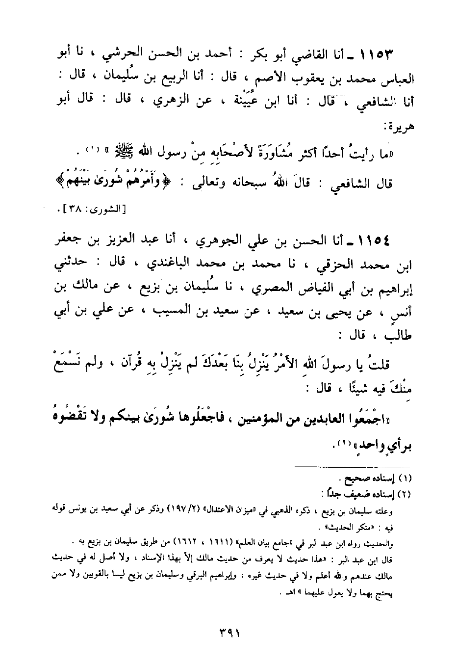 أنا الْقَاضِي أَبُو بَكْرٍ: أَحْمَدُ بْنُ الْحَسَنِ الْحَرَشِيُّ , نا أَبُو الْعَبَّاسِ , مُحَمَّدُ بْنُ يَعْقُوبَ الْأَصَمُّ , قَالَ: أنا الرَّبِيعُ بْنُ سُلَيْمَانَ , قَالَ: أنا الشَّافِعِيُّ , قَالَ: أنا ابْنُ عُيَيْنَةَ , عَنِ الزُّهْرِيِّ , قَالَ: قَالَ أَبُو هُرَيْرَةَ: «مَا رَأَيْتُ أَحَدًا أَكْثَرَ مُشَاوَرَةً لِأَصْحَابِهِ مِنْ رَسُولِ اللَّهِ صَلَّى اللهُ عَلَيْهِ وَسَلَّمَ» قَالَ الشَّافِعِيُّ: قَالَ اللَّهُ سُبْحَانَهُ وَتَعَالَى: {وَأَمْرُهُمْ شُورَى بَيْنَهُمْ} [الشورى: ٣٨]