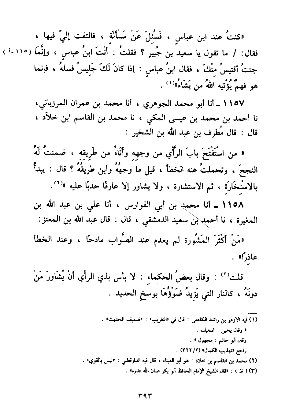 أنا أَبُو مُحَمَّدٍ الْجَوْهَرِيُّ , أنا مُحَمَّدُ بْنُ عِمْرَانَ الْمَرْزَبَانِيُّ , نا أَحْمَدُ بْنُ مُحَمَّدِ بْنِ عِيسَى الْمَكِّيُّ , نا مُحَمَّدُ بْنُ الْقَاسِمِ بْنِ خَلَّادٍ , قَالَ: قَالَ مُطَرِّفُ بْنُ عَبْدِ اللَّهِ بْنِ الشِّخِّيرِ: «مَنِ اسْتَفْتَحَ بَابَ الرَّأْيِ مِنْ وَجْهِهِ وَأَتَاهُ مِنْ طَرِيقِهِ , ضَمِنْتُ لَهُ النَّجْحَ , وَتَحَمَّلْتُ عَنْهُ الْخَطَأَ» , قِيلَ مَا وَجْهُهُ وَأَيْنَ طَرِيقُهُ؟ قَالَ: «يَبْدَأُ بِالِاسْتِخَارَةِ , ثُمَّ الِاسْتِشَارَةِ , وَلَا يُشَاوِرْ إِلَّا عَارِفًا حَدْبًا عَلَيْهِ»