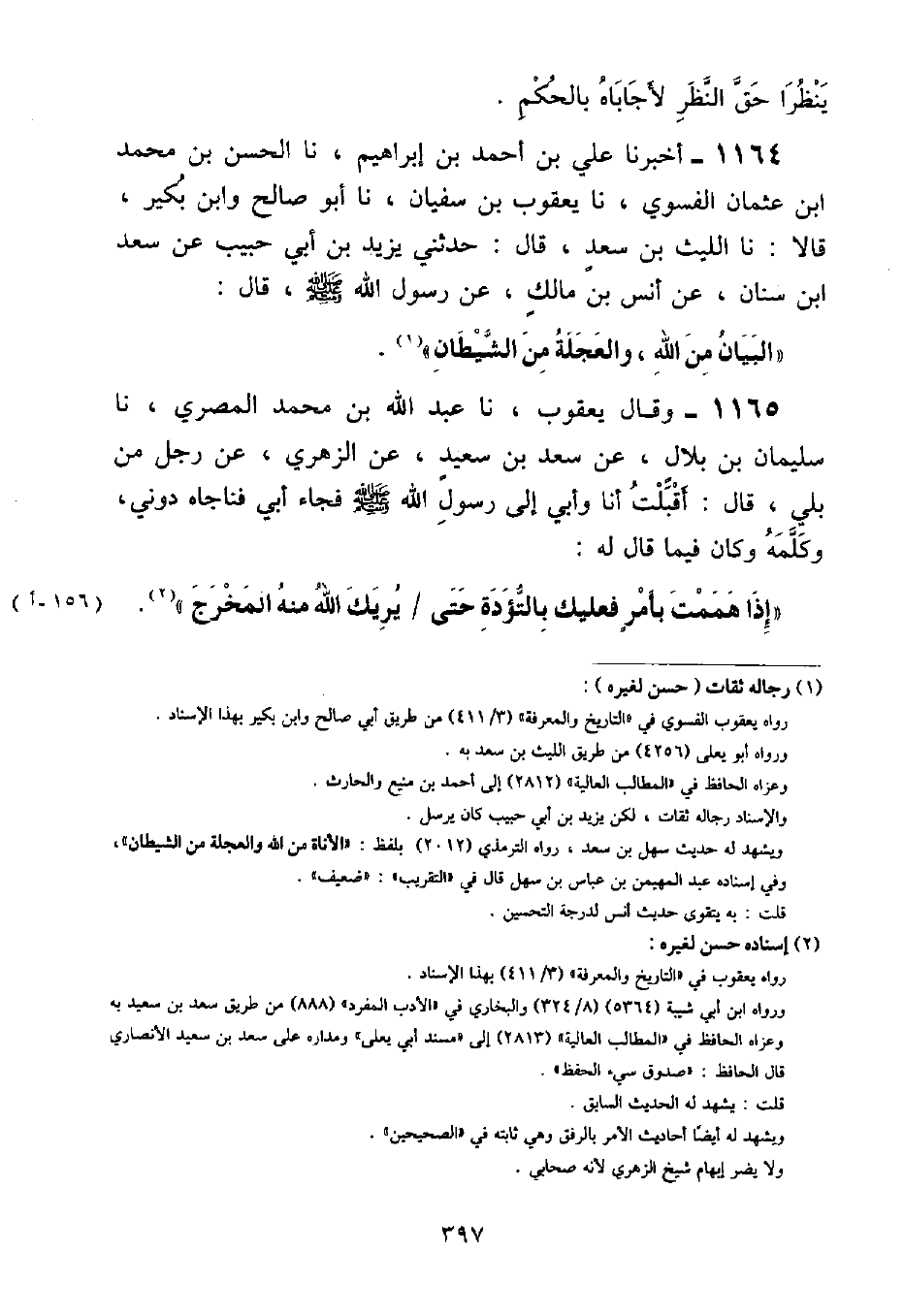أَخْبَرَنَا عَلِيُّ بْنُ أَحْمَدَ بْنِ إِبْرَاهِيمَ , نا الْحَسَنُ بْنُ مُحَمَّدِ بْنِ عُثْمَانَ الْفَسَوِيُّ , نا يَعْقُوبُ بْنُ سُفْيَانَ , نا أَبُو صَالِحٍ , وَابْنُ بُكَيْرٍ , قَالَا: نا اللَّيْثُ بْنُ سَعْدٍ , قَالَ: حَدَّثَنِي يَزِيدُ بْنُ أَبِي حَبِيبٍ , عَنْ سَعْدِ بْنِ سِنَانٍ , عَنْ أَنَسِ بْنِ مَالِكٍ , عَنْ رَسُولِ اللَّهِ صَلَّى اللهُ عَلَيْهِ وَسَلَّمَ , قَالَ: «الْبَيَانُ مِنَ اللَّهِ , وَالْعَجَلَةُ مِنَ الشَّيْطَانِ»