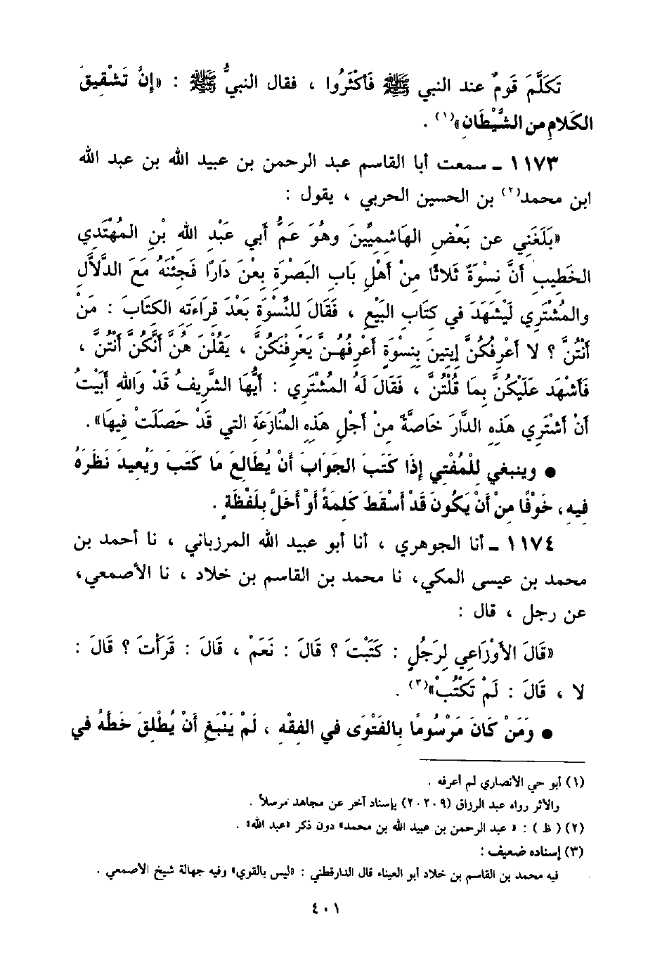 وَيَنْبَغِي لِلْمُفْتِي إِذَا كَتَبَ الْجَوَابَ أَنْ يُطَالِعَ مَا كَتَبَ وَيُعِيدَ نَظَرَهُ فِيهِ , خَوْفًا مِنْ أَنْ يَكُونَ قَدْ أَسْقَطَ كَلِمَةً أَوْ أَخَلَّ بِلَفْظِة أنا الْجَوْهَرِيُّ , أنا أَبُو عُبَيْدِ اللَّهِ الْمَرْزَبَانِيُّ , نا أَحْمَدُ بْنُ مُحَمَّدِ بْنِ عِيسَى الْمَكِّيُّ , نا مُحَمَّدُ بْنُ الْقَاسِمِ بْنِ خَلَّادٍ , نا الْأَصْمَعِيُّ , عَنْ رَجُلٍ , قَالَ: قَالَ الْأَوْزَاعِيُّ لِرَجُلٍ: «كَتَبْتَ؟» قَالَ: نَعَمْ , قَالَ: «قَرَأْتَ؟» قَالَ: لَا , قَالَ: «لَمْ تَكْتُبْ» وَمَنْ كَانَ مَرْسُومًا بِالْفَتْوَى فِي الْفِقْهِ , لَمْ يَنْبَغِ أَنْ يُطْلِقَ خَطَّهُ فِي