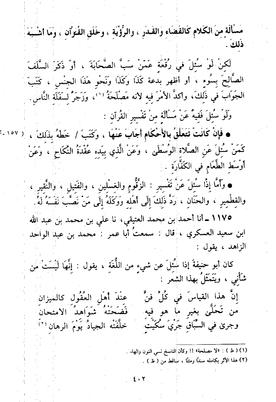 مَسْأَلَةٍ مِنَ الْكَلَامِ كَالْقَضَاءِ وَالْقَدَرِ , وَالرُّؤْيَةِ , وَخَلْقِ الْقُرْآنِ , وَمَا أَشْبَهَ ذَلِكَ لَكِنْ لَوْ سُئِلَ فِي رُقْعَةٍ عَمَّنْ سَبَّ الصَّحَابَةَ , أَوْ ذَكَرَ السَّلَفَ الصَّالِحَ بِسُوءٍ , أَوْ أَظْهَرَ بِدْعَةَ كَذَا وَكَذَا وَنَحْوَ هَذَا الْجِنْسَ , كَتَبَ الْجَوَابَ فِي ذَلِكَ , وَأَكَّدَ الْأَمْرَ فِيهِ لِأَنَّهُ مَصْلَحَةٌ , وَزَجَرٌ لِسَفَلَةِ النَّاسِ وَلَوْ سُئِلَ فَقِيهٌ عَنْ مَسْأَلَةٍ مِنْ تَفْسِيرِ الْقُرْآنِ: فَإِنْ كَانَتْ تَتَعَلَّقُ بِالْأَحْكَامِ أَجَابَ عَنْهَا , وَكَتَبَ خَطَّهُ بِذَلِكَ , كَمَنْ سُئِلَ عَنِ الصَّلَاةِ الْوسْطَى , وَعَنِ الَّذِي بِيَدِهِ عُقَدَةُ النِّكَاحِ , وَعَنْ أَوْسَطِ الطَّعَامِ فِي الْكَفَّارَةِ وَأَمَّا إِذَا سُئِلَ عَنْ تَفْسِيرِ: الزَّقُّومِ وَالْغِسْلِينَ , وَالْفَتِيلِ , وَالنَّقِيرِ , وَالْقِطْمِيرِ , وَالْحَنَانِ , رَدَّ ذَلِكَ إِلَى أَهْلِهِ وَوَكَّلَهُ إِلَى مَنْ نَصَبَ نَفْسَهُ لَهُ