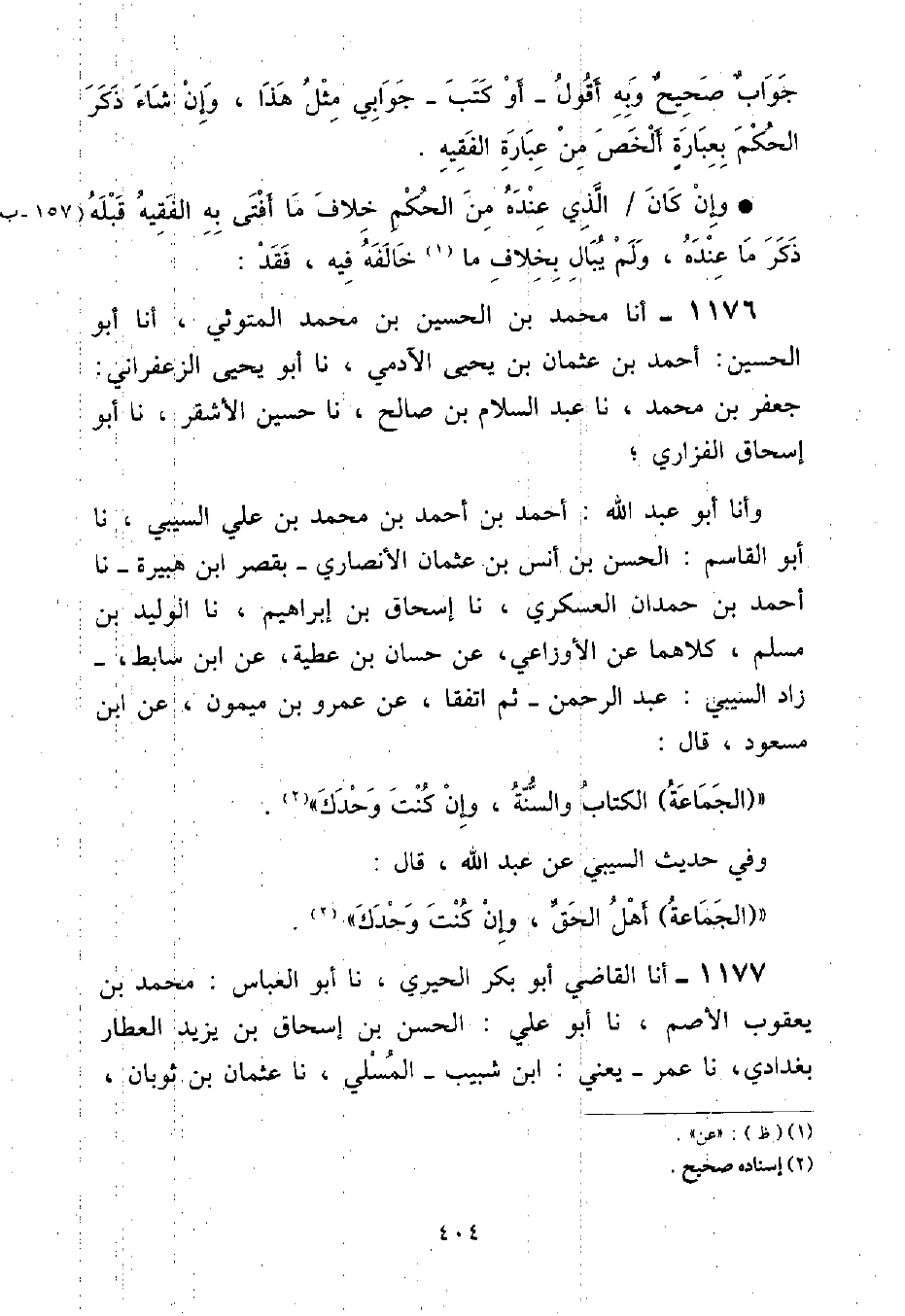 وَإِنْ كَانَ الَّذِي عِنْدَهُ مِنَ الْحُكْمِ خِلَافَ مَا أَفْتَى بِهِ الْفَقِيهُ قَبْلَهُ ذَكَرَ مَا عِنْدَهُ , وَلَمْ يُبَالِ بِخِلَافِ مَا خَالَفَهُ فِيهِ , فَقَدْ: أنا مُحَمَّدُ بْنُ الْحُسَيْنِ بْنِ مُحَمَّدٍ الْمَتُّوثِيُّ , أنا أَبُو الْحُسَيْنِ أَحْمَدُ بْنُ عُثْمَانَ بْنِ يَحْيَى الْآدَمَيُّ , نا أَبُو يَحْيَى الزَّعْفَرَانِيُّ جَعْفَرُ بْنُ مُحَمَّدٍ , نا عَبْدُ السَّلَامِ بْنُ صَالِحٍ , نا حُسَيْنُ الْأَشْقَرُ , نا أَبُو إِسْحَاقَ الْفَزَارِيُّ , وأنا أَبُو عَبْدِ اللَّهِ أَحْمَدُ بْنُ أَحْمَدَ بْنِ مُحَمَّدِ بْنِ عَلِيٍّ السَّيْبِيُّ , نا أَبُو الْقَاسِمِ الْحَسَنُ بْنُ أَنَسِ بْنِ عُثْمَانَ الْأَنْصَارِيُّ بِقَصْرِ ابْنِ هُبَيْرَةَ نا أَحْمَدُ بْنُ حَمْدَانَ الْعَسْكَرِيُّ , نا إِسْحَاقُ بْنُ إِبْرَاهِيمَ , نا الْوَلِيدُ بْنُ مُسْلِمٍ , كِلَاهُمَا عَنِ الْأَوْزَاعِيِّ , عَنْ حَسَّانَ بْنِ عَطِيَّةَ , عَنِ ابْنِ سَابِطٍ , زَادَ السَّيْبِيُّ: عَبْدُ الرَّحْمَنِ ثُمَّ اتَّفَقَا , عَنْ عَمْرِو بْنِ مَيْمُونٍ , عَنِ ابْنِ مَسْعُودٍ , قَالَ: «الْجَمَاعَةُ الْكِتَابُ وَالسُّنَّةُ , وَإِنْ كُنْتَ وَحْدَكَ» وَفِي حَدِيثِ السَّيْبِيِّ عَنْ عَبْدِ اللَّهِ , قَالَ: الْجَمَاعَةُ أَهْلُ الْحَقِّ , وَإِنْ كُنْتَ وَحْدَكَ