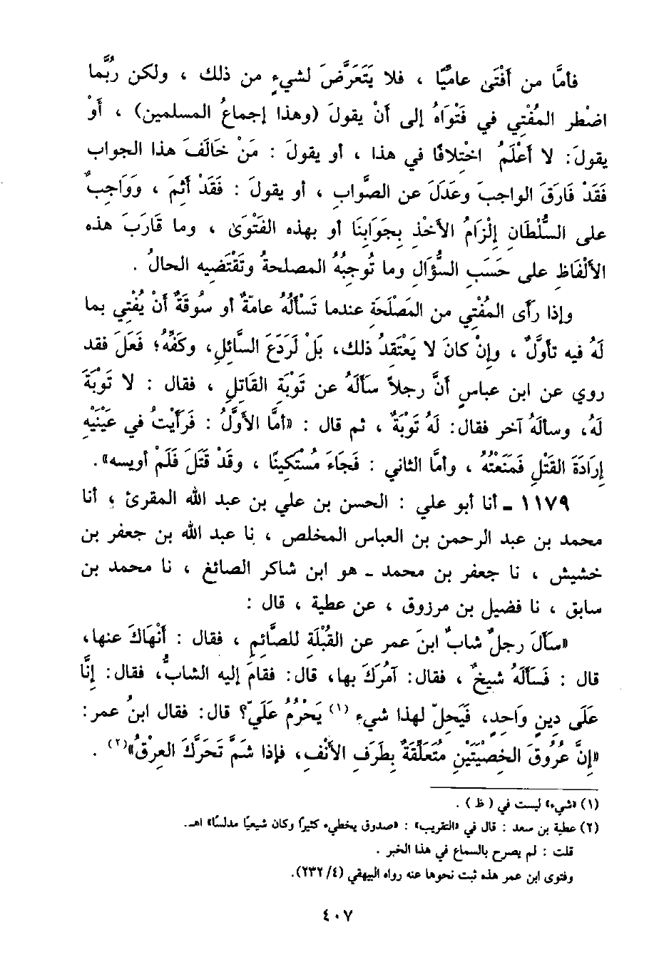 أنا أَبُو عَلِيٍّ الْحَسَنُ بْنُ عَلِيِّ بْنِ عَبْدِ اللَّهِ الْمُقْرِئُ , أنا مُحَمَّدُ بْنُ عَبْدِ الرَّحْمَنِ بْنِ الْعَبَّاسِ الْمُخْلِصُ , نا عَبْدُ اللَّهِ بْنُ جَعْفَرِ بْنِ خُشَيْشٍ , نا جَعْفَرُ بْنُ مُحَمَّدٍ هُوَ ابْنُ شَاكِرٍ الصَّائِغُ , نا مُحَمَّدُ بْنُ سَابِقٍ , نا فُضَيْلُ بْنُ مَرْزُوقٍ , عَنْ عَطِيَّةَ , قَالَ: سَأَلَ رَجُلٌ شَابٌّ ابْنَ عُمَرَ عَنِ الْقُبْلَةِ لِلصَّائِمِ , فَقَالَ: «أَنْهَاكَ عَنْهَا» , قَالَ: فَسَأَلَهُ شَيْخٌ , فَقَالَ: «آمُرُكَ بِهَا» , قَالَ: فَقَامَ إِلَيْهِ الشَّابُّ , فَقَالَ: إِنَّا عَلَى دِينٍ وَاحِدٍ , فَيَحِلُّ لِهَذَا شَيْءٌ يَحْرُمُ عَلَيَّ؟ قَالَ: فَقَالَ ابْنُ عُمَرَ: «إِنَّ عُرُوقَ الْخَصْيَتَيْنِ مُتَعَلِّقَةٌ بِطَرَفِ الْأَنْفِ , فَإِذَا شَمَّ تَحَرَّكَ الْعِرْقُ» ⦗٤٠٨⦘ قُلْتُ: أَرَادَ ابْنُ عُمَرَ , أَنَّ الشَّابَّ قَوِيُّ الشَّهْوَةِ , فَلَا يُؤْمَنُ أَنْ تُحْدِثَ لَهُ الْقُبْلَةُ مَا يُفْسِدُ صَوْمَهُ , وَالشَّيْخُ يُؤْمَنُ ذَلِكَ فِي حَقِّهِ , لِضَعْفِ شَهْوَتِهِ , وَقَدْ رُوِيَ عَنْ رَسُولِ اللَّهِ صَلَّى اللهُ عَلَيْهِ وَسَلَّمَ فِي هَذِهِ الْمَسْأَلَةِ مِثْلُ فَتْوَى ابْنِ عُمَرَ:
