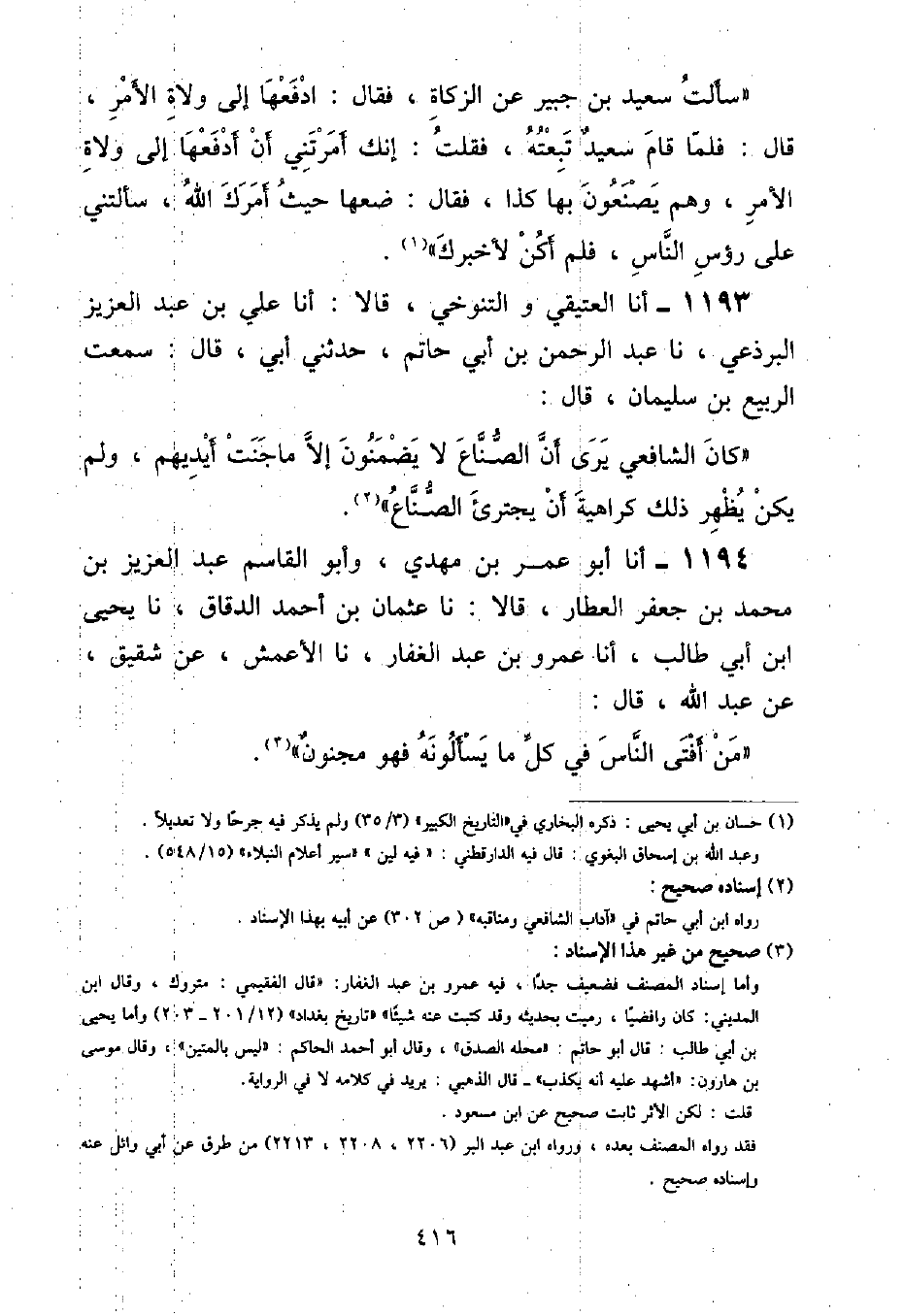 أنا الْعُتَيْقِيُّ , وَالتَّنُوخِيُّ , قَالَا: أنا عَلِيُّ بْنُ عَبْدِ الْعَزِيزِ الْبَرْذَعِيُّ , نا عَبْدُ الرَّحْمَنِ بْنُ أَبِي حَاتِمٍ , حَدَّثَنِي أَبِي قَالَ: سَمِعْتُ الرَّبِيعَ بْنَ سُلَيْمَانَ , قَالَ: «كَانَ الشَّافِعِيُّ يَرَى أَنَّ الصُّنَّاعَ لَا يَضْمَنُونَ إِلَّا مَا جَنَتْ أَيْدِيهِمْ , وَلَمْ يَكُنْ يُظْهِرُ ذَلِكَ كَرَاهِيَةَ أَنْ يَجْتَرِئَ الصُّنَّاعُ»