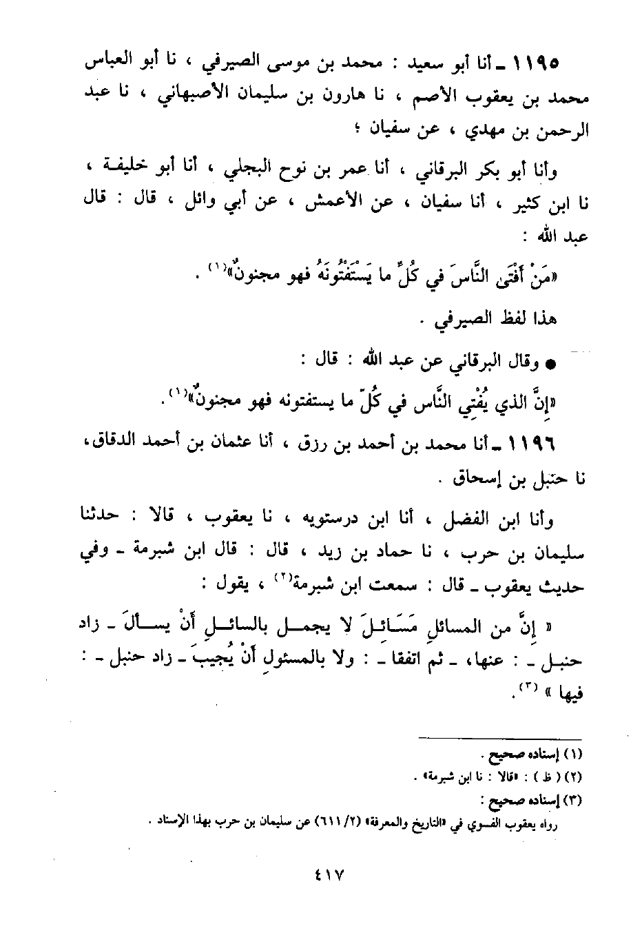 أنا أَبُو سَعِيدٍ مُحَمَّدُ بْنُ مُوسَى الصَّيْرَفِيُّ , نا أَبُو الْعَبَّاسِ مُحَمَّدُ بْنُ يَعْقُوبَ الْأَصَمُّ , نا هَارُونُ بْنُ سُلَيْمَانَ الْأَصْبَهَانِيُّ , نا عَبْدُ الرَّحْمَنِ بْنُ مَهْدِيٍّ , عَنْ سُفْيَانَ , وأنا أَبُو بَكْرٍ الْبَرْقَانِيُّ , أنا عُمَرُ بْنُ نُوحٍ الْبَجَلِيُّ , أنا أَبُو خَلِيفَةَ , نا ابْنُ كَثِيرٍ , أنا سُفْيَانُ , عَنِ الْأَعْمَشِ , عَنْ أَبِي وَائِلٍ , قَالَ: قَالَ عَبْدُ اللَّهِ: «مَنْ أَفْتَى النَّاسَ فِي كُلِّ مَا يَسْتَفْتُونَهُ فَهُوَ مَجْنُونٌ» هَذَا لَفْظُ الصَّيْرَفِيِّ