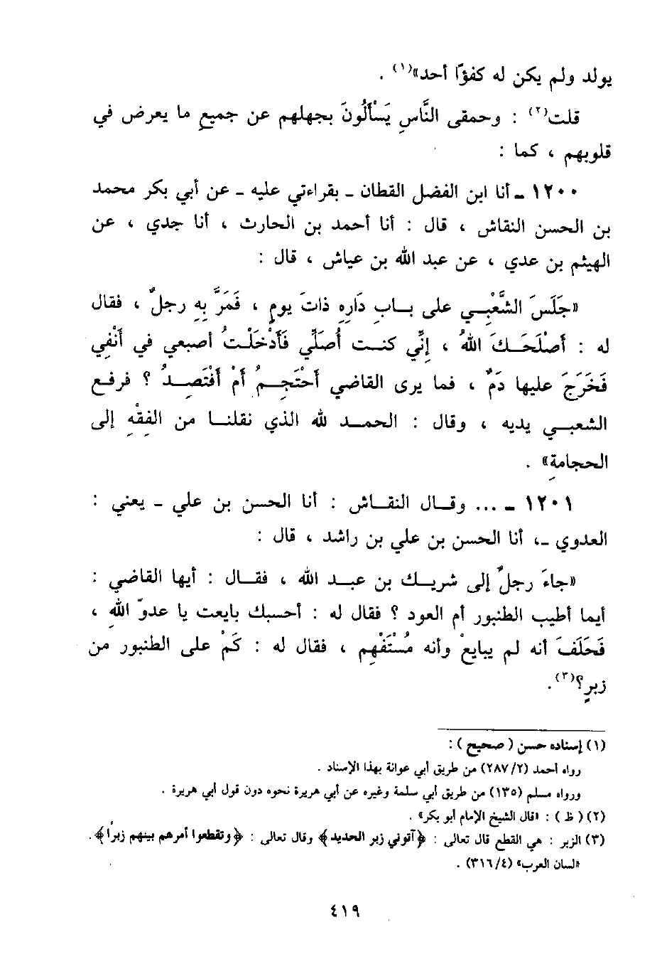 قُلْتُ: وَحَمْقَى النَّاسِ يَسْأَلُونَ بِجَهْلِهِمْ عَنْ جَمِيعِ مَا يَعْرِضُ فِي قُلُوبِهِمْ , كَمَا: أنا ابْنُ الْفَضْلِ الْقَطَّانُ , بِقِرَاءَتِي عَلَيْهِ، عَنْ أَبِي بَكْرٍ , مُحَمَّدِ بْنِ الْحَسَنِ النَّقَّاشِ , قَالَ: أنا أَحْمَدُ بْنُ الْحَارِثِ , أنا جَدِّي , عَنِ الْهَيْثَمِ بْنِ عَدِيٍّ , عَنْ عَبْدِ اللَّهِ بْنِ عَيَّاشٍ , قَالَ: جَلَسَ الشَّعْبِيُّ عَلَى بَابِ دَارِهِ ذَاتَ يَوْمٍ , فَمَرَّ بِهِ رَجُلٌ , فَقَالَ لَهُ: أَصْلَحَكَ اللَّهُ , إِنِّي كُنْتُ أُصَلِّي فَأَدْخَلْتُ أُصْبُعِي فِي أَنْفِي فَخَرَجَ عَلَيْهَا دَمٌ , فَمَا يَرَى الْقَاضِي أَحْتَجِمُ أَمْ أَفْتَصِدُ؟ فَرَفَعَ الشَّعْبِيُّ يَدَيْهِ , وَقَالَ: «الْحَمْدُ لِلَّهِ الَّذِي نَقَلَنَا مِنَ الْفِقْهِ إِلَى الْحِجَامَةِ»