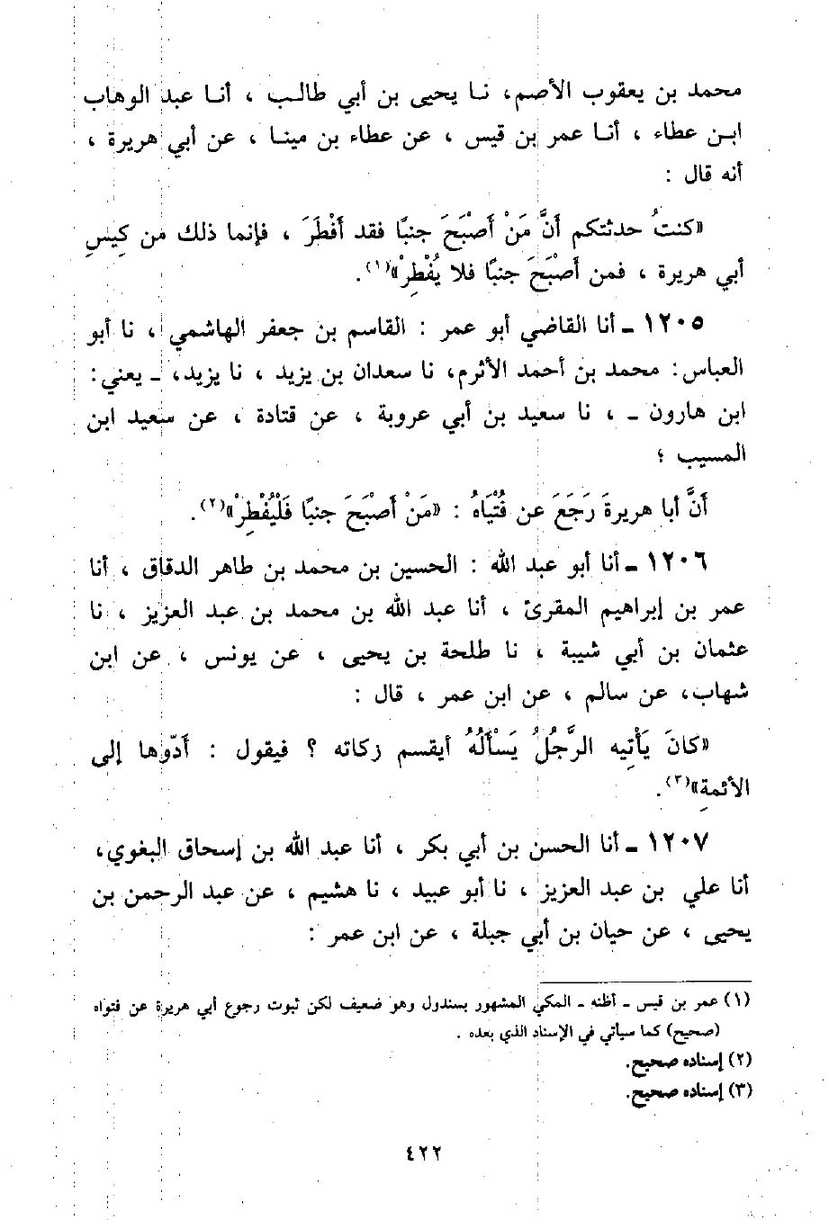 أنا الْقَاضِي أَبُو عُمَرَ الْقَاسِمُ بْنُ جَعْفَرٍ الْهَاشِمِيُّ , نا أَبُو الْعَبَّاسِ مُحَمَّدُ بْنُ أَحْمَدَ الْأَثْرَمُ , نا سَعْدَانُ بْنُ يَزِيدَ , نا يَزِيدُ يَعْنِي ابْنَ هَارُونَ , نا سَعِيدُ بْنُ أَبِي عَرُوبَةَ , عَنْ قَتَادَةَ , عَنْ سَعِيدِ بْنِ الْمُسَيِّبِ , " أَنَّ أَبَا هُرَيْرَةَ , رَجَعَ عَنْ فُتْيَاهُ: مَنْ أَصْبَحَ جُنُبًا فَلْيُفْطِرْ "