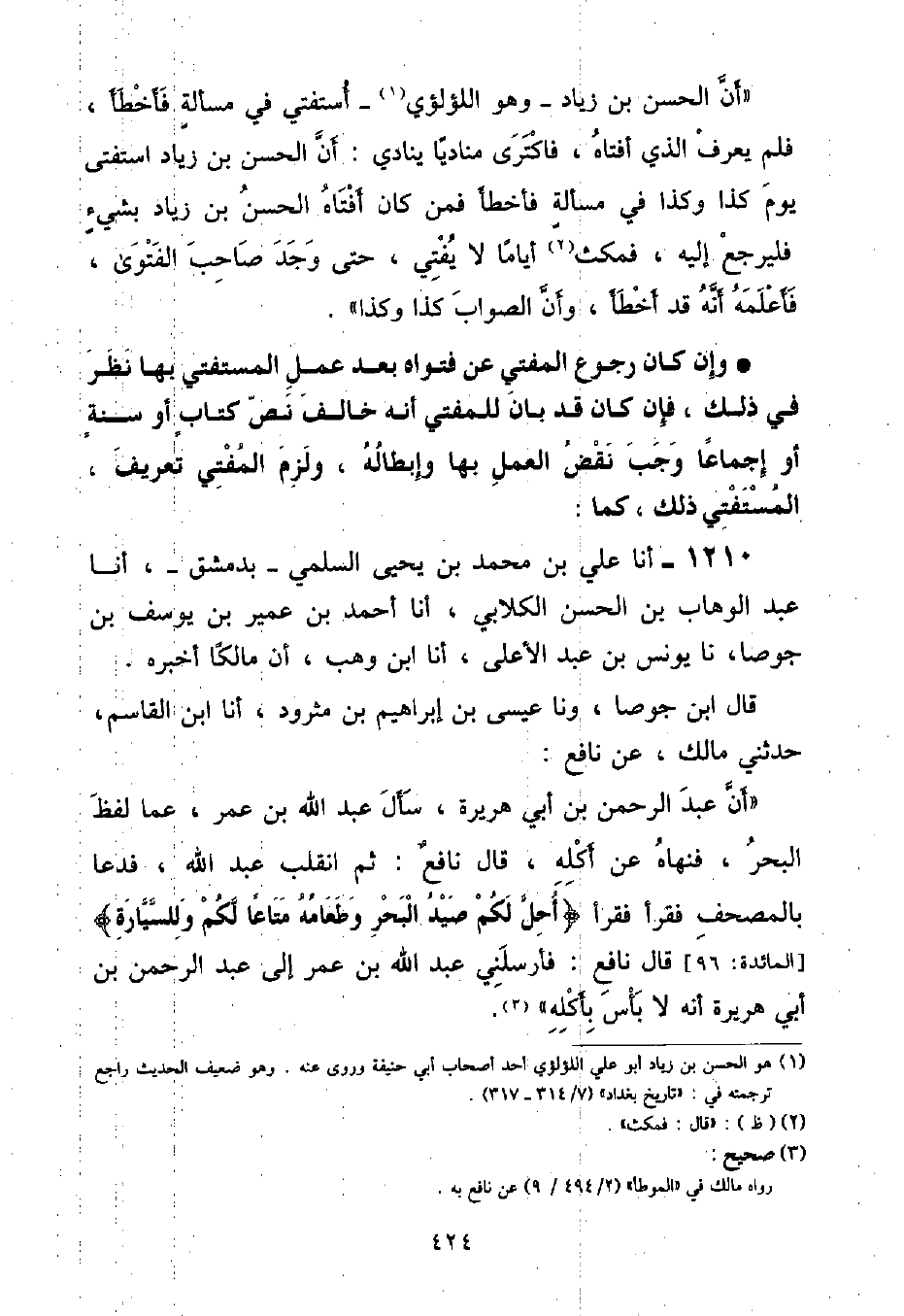 وَإِنْ كَانَ رُجُوعُ الْمُفْتِي عَنْ فَتْوَاهُ بَعْدَ عَمَلِ الْمُسْتَفْتِي بِهَا نَظَرٌ فِي ذَلِكَ , فَإِنْ كَانَ قَدْ بَانَ لِلْمُفْتِي أَنَّهُ خَالَفَ نَصَّ كِتَابٍ أَوْ سُنَّةٍ أَوْ إِجْمَاعٍ وَجَبَ نَقْضُ الْعَمَلِ بِهَا وَإِبْطَالُهُ , وَلَزِمَ الْمُفْتِيَ تَعْرِيفُ الْمُسْتَفْتِي ذَلِكَ , كَمَا: أنا عَلِيُّ بْنُ مُحَمَّدِ بْنِ يَحْيَى السُّلَمِيُّ , بِدِمَشْقَ , أنا عَبْدُ الْوَهَّابِ بْنُ الْحَسَنِ الْكِلَابِيُّ , أنا أَحْمَدُ بْنُ عُمَيْرِ بْنِ يُوسُفَ بْنِ جُوصَا , نا يُونُسُ بْنُ عَبْدِ الْأَعْلَى , أنا ابْنُ وَهْبٍ , أَنَّ مَالِكًا , أَخْبَرَهُ قَالَ ابْنُ جُوصَا , ونا عِيسَى بْنُ إِبْرَاهِيمَ بْنِ مَثْرُودٍ , أنا ابْنُ الْقَاسِمِ , حَدَّثَنِي مَالِكٌ , عَنْ نَافِعٍ: " أَنَّ عَبْدَ الرَّحْمَنِ بْنِ أَبِي هُرَيْرَةَ , سَأَلَ عَبْدَ اللَّهِ بْنَ عُمَرَ , عَمَّا لَفَظَ الْبَحْرُ , فَنَهَاهُ عَنْ أَكْلِهِ , قَالَ نَافِعٌ: ثُمَّ انْقَلَبَ عَبْدُ اللَّهِ , فَدَعَا بِالْمُصْحَفِ فَقَرَأَ {أُحِلَّ لَكُمْ صَيْدُ الْبَحْرِ وَطَعَامُهُ مَتَاعًا لَكُمْ وَلِلسَّيَّارَةِ} [المائدة: ٩٦] " قَالَ نَافِعٌ: «فَأَرْسَلَنِي عَبْدُ اللَّهِ بْنُ عُمَرَ إِلَى عَبْدِ الرَّحْمَنِ بْنِ أَبِي هُرَيْرَةَ أَنَّهُ لَا بَأْسَ بِأَكْلِهِ»