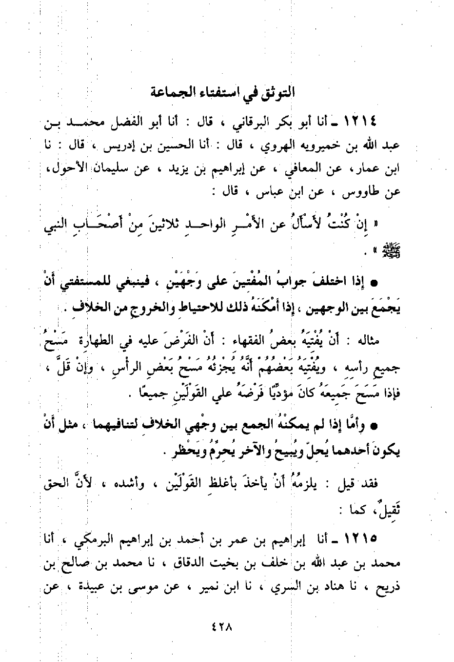 أنا أَبُو بَكْرٍ الْبَرْقَانِيُّ , قَالَ: أنا أَبُو الْفَضْلِ مُحَمَّدُ بْنُ عَبْدِ اللَّهِ بْنِ خَمِيرَوَيْهِ الْهَرَوِيُّ , قَالَ: أنا الْحُسَيْنُ بْنُ إِدْرِيسَ , قَالَ: نَا ابْنُ عَمَّارٍ , عَنِ الْمُعَافَى , عَنْ إِبْرَاهِيمَ بْنِ يَزِيدَ , عَنْ سُلَيْمَانَ الْأَحْوَلِ , عَنْ طَاوُسٍ , عَنِ ابْنِ عَبَّاسٍ , قَالَ: «إِنْ كُنْتُ لِأَسْأَلُ عَنِ الْأَمْرِ الْوَاحِدِ , ثَلَاثِينَ مِنْ أَصْحَابِ النَّبِيِّ صَلَّى اللهُ عَلَيْهِ وَسَلَّمَ» إِذَا اخْتَلَفَ جَوَابُ الْمُفْتِينَ عَلَى وَجْهَيْنِ , فَيَنْبَغِي لِلْمُسْتَفْتِي أَنْ يَجْمَعَ بَيْنَ الْوَجْهَيْنِ , إِذَا أَمْكَنَهُ ذَلِكَ لِلْاحْتِيَاطِ وَالْخُرُوجِ مِنَ الْخِلَافِ مِثَالُهُ: أَنْ يُفْتِيَهُ بَعْضُ الْفُقَهَاءِ: أَنَّ الْفَرْضَ عَلَيْهِ فِي الطَّهَارَةِ مَسْحُ جَمِيعِ رَأْسِهِ , وَيُفْتِيهِ بَعْضُهُمْ أَنَّهُ يُجْزِئُهُ مَسْحُ بَعْضِ الرَّأْسِ , وَإِنْ قَلَّ , فَإِذَا مَسَحَ جَمِيعَهُ كَانَ مُؤَدِّيًا فَرْضَهُ عَلَى الْقَوْلَيْنِ جَمِيعًا وَأَمَّا إِذَا لَمْ يُمْكِنْهُ الْجَمْعُ بَيْنَ وَجْهَيِ الْخِلَافِ لِتَنَافِيهِمَا , مِثْلَ أَنْ يَكُونَ أَحَدُهُمَا يُحِلُّ وَيُبِيحُ وَالْآخَرُ يُحَرِّمُ وَيَحْظُرُ فَقَدْ قِيلَ: يَلْزَمُهُ أَنْ يَأْخُذَ بِأَغْلَظِ الْقَوْلَيْنِ , وَأَشَدِّهِ , لِأَنَّ الْحَقَّ ثَقِيلٌ