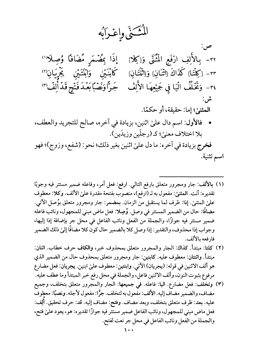٣٣ - (كِلْتَا) كَذَاكَ (اثْنَانِ) وَ (اثْنَتَانِ) ... كَابْنَيْنِ وابْنَتَيْنِ يَجْريَانِ (¬٢)
