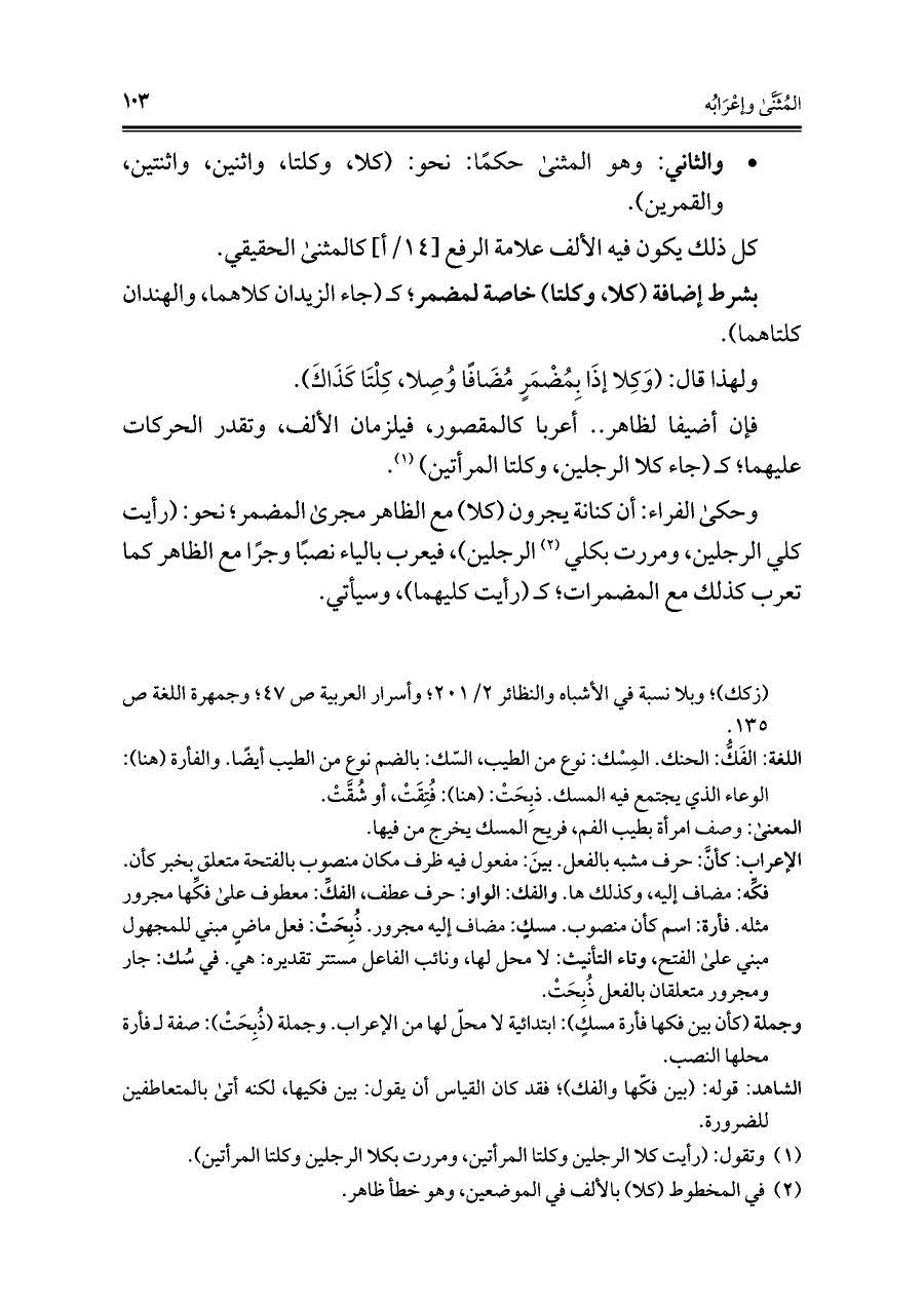 وحكى الفراء: أن كنانة يجرون (كلا) مع الظاهر مجرى المضمر؛ نحو: (رأيت كلي الرجلين، ومررت بكلي (٢) الرجلين)، فيعرب بالياء نصبًا وجرًا مع الظاهر كما تعرب كذلك مع المضمرات؛ كـ (رأيت كليهما)، وسيأتي.