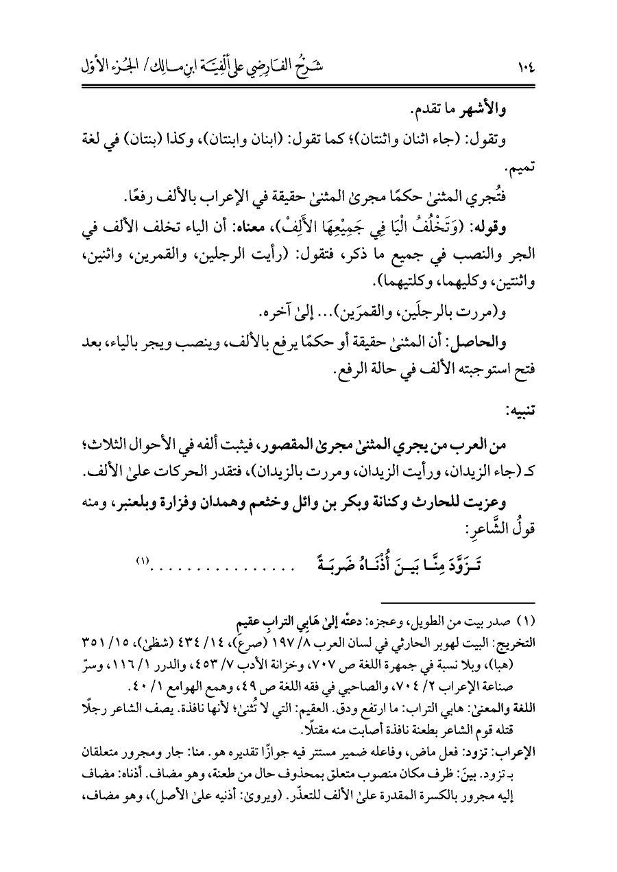 والحاصل: أن المثنى حقيقة أو حكمًا يرفع بالألف, وينصب ويجر بالياء، بعد فتح استوجبته الألف في حالة الرفع.