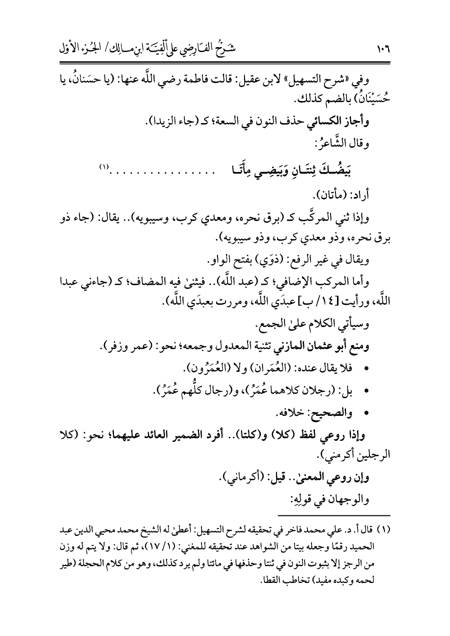 (¬١) قال أ. د. علي محمد فاخر في تحقيقه لشرح التسهيل: أعطى له الشيخ محمد محيي الدين عبد الحميد رقمًا وجعله بيتا من الشواهد عند تحقيقه للمغني: (١/ ١٧)، ثم قال: ولا يتم له وزن من الرجز إلا بثبوت النون في ثنتا وحذفها في مائتا ولم يرد كذلك، وهو من كلام الحجلة (طير لحمه وكبده مفيد) تخاطب القطا.