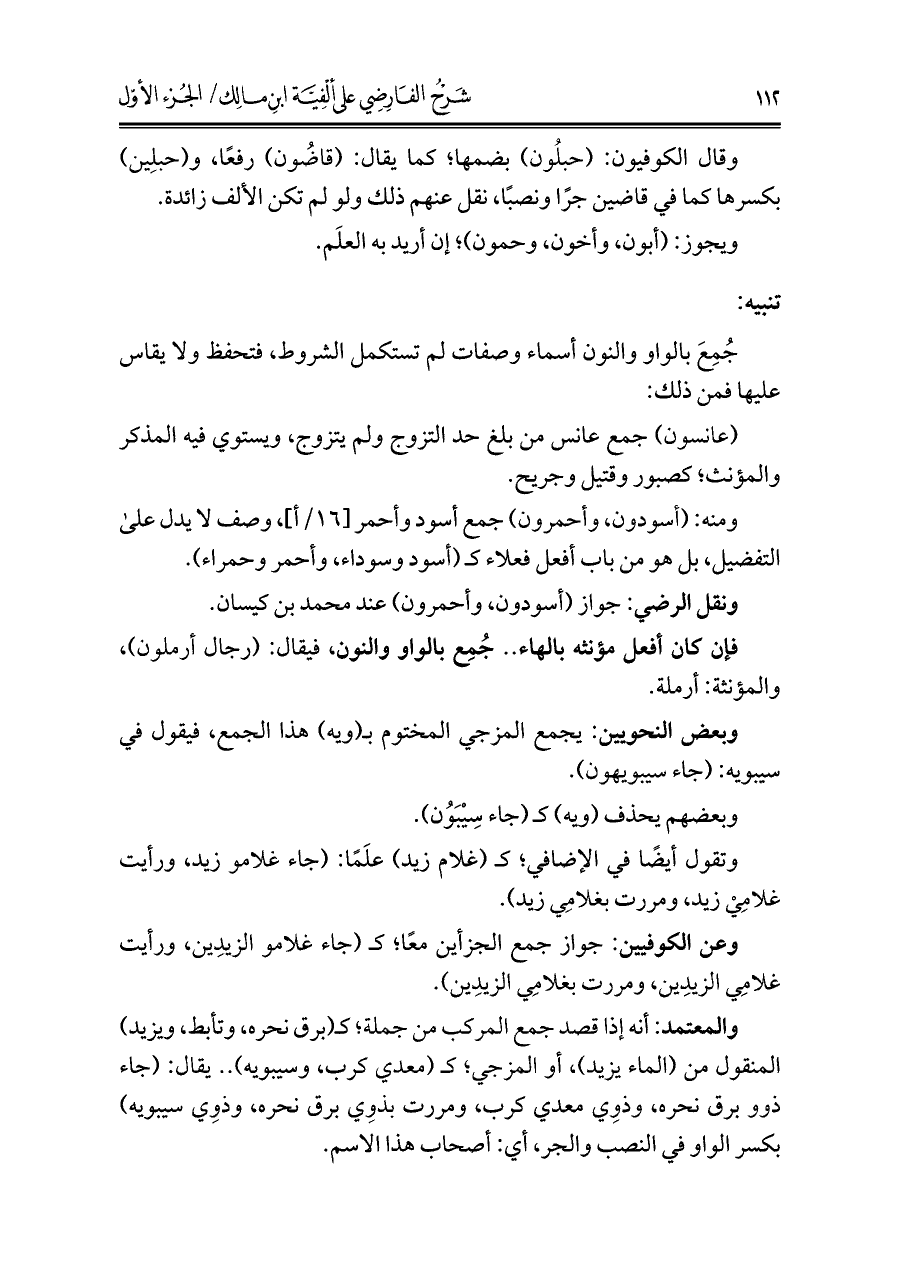وعن الكوفيين: جواز جمع الجزأين معًا؛ كـ (جاء غلامو الزيدِين، ورأيت غلامي الزيدِين، ومررت بغلامي الزيدِين).