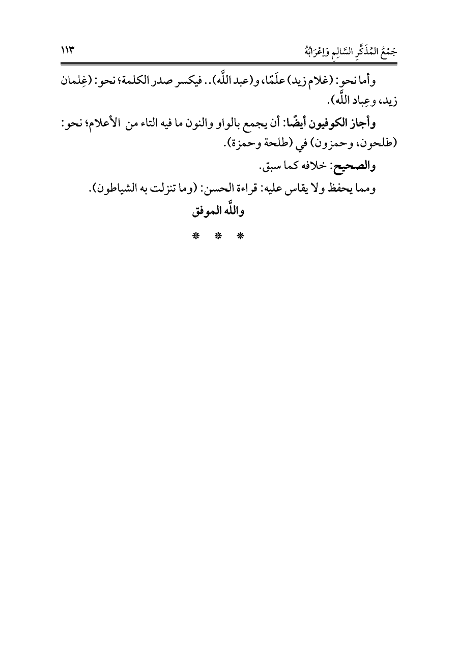 وأجاز الكوفيون أيضًا: أن يجمع بالواو والنون ما فيه التاء من الأعلام؛ نحو: (طلحون، وحمزون) في (طلحة وحمزة).