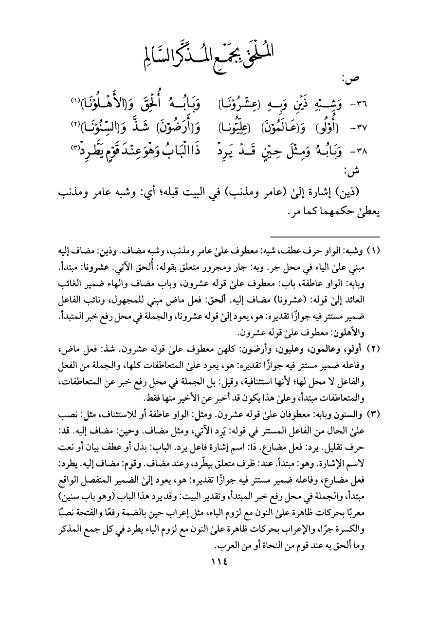 (¬٣) والسنون وبابه: معطوفان على قوله عشرون. ومثل: الواو عاطفة أو للاستئناف، مثل: نصب على الحال من الفاعل المستتر في قوله: يَرِد الآتي، ومثل مضاف. وحين: مضاف إليه. قد: حرف تقليل. يرد: فعل مضارع. ذا: اسم إشارة فاعل يرد. الباب: بدل أو عطف بيان أو نعت لاسم الإشارة. وهو: مبتدأ. عند: ظرف متعلق بيطّرد، وعند مضاف. وقوم: مضاف إليه. يطرد: فعل مضارع، وفاعله ضمير مستتر فيه جوازًا تقديره: هو، يعود إلى الضَمير المنفصل الواقع مبتدأ، والجملة في محلّ رفع خبر المبتدأ، وتقدير البيت: وقد يرد هذا الباب (وهو باب سنين) معربًا بحركات ظاهرة على النون مع لزوم الياء، مثل إعراب حين بالضمة رفعًا والفتحة نصبًا والكسرة جرًا، والإعراب بحركات ظاهرة على النون مع لزوم الياء يطرد في كل جمع المذكر وما ألحق به عند قوم من النحاة أو من العرب.
