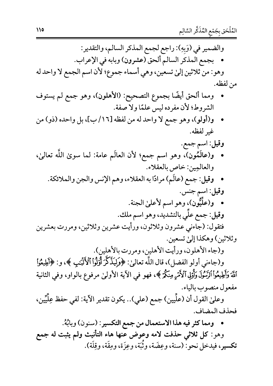 و (جاءني أولو الفضل)، قال اللَّه تعالى: {وَلِيَذَّكَّرَ أُولُو الْأَلْبَابِ}، و: {أَطِيعُوا اللَّهَ وَأَطِيعُوا الرَّسُولَ وَأُولِي الْأَمْرِ مِنْكُمْ}، فهو في الآية الأولى مرفوع بالواو، وفي الثانية مفعول منصوب بالياء.