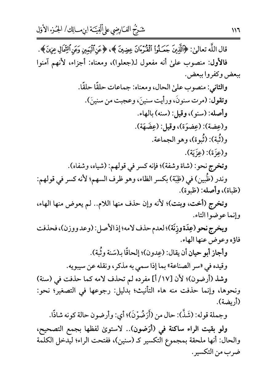 وشذ (أرضون)؛ لأن مفرده لم تحذف لامه كما حذفت في (سنة) ونحوها، وإنما حذفت منه هاء التأنيث؛ بدليل: رجوعها في التصغير، نحو: (أريضة).