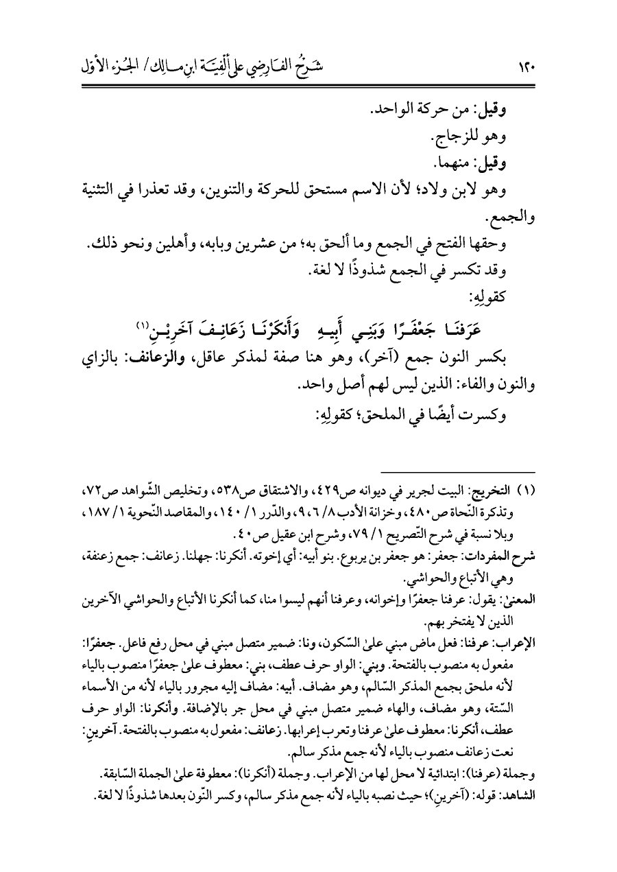 الإعراب: عرفنا: فعل ماض مبني على السّكون، ونا: ضمير متصل مبني في محلّ رفع فاعل. جعفرًا: مفعول به منصوب بالفتحة. وبني: الواو حرف عطف، بني: معطوف على جعفرًا منصوب بالياء لأنه ملحق بجمع المذكر السّالم، وهو مضاف. أبيه: مضاف إليه مجرور بالياء لأنه من الأسماء السّتة، وهو مضاف، والهاء ضمير متصل مبني في محلّ جر بالإضافة. وأنكرنا: الواو حرف عطف، أنكرنا: معطوف على عرفنا وتعرب إعرابها. زعانف: مفعول به منصوب بالفتحة. آخرينِ: نعت زعانف منصوب بالياء لأنه جمع مذكر سالم.