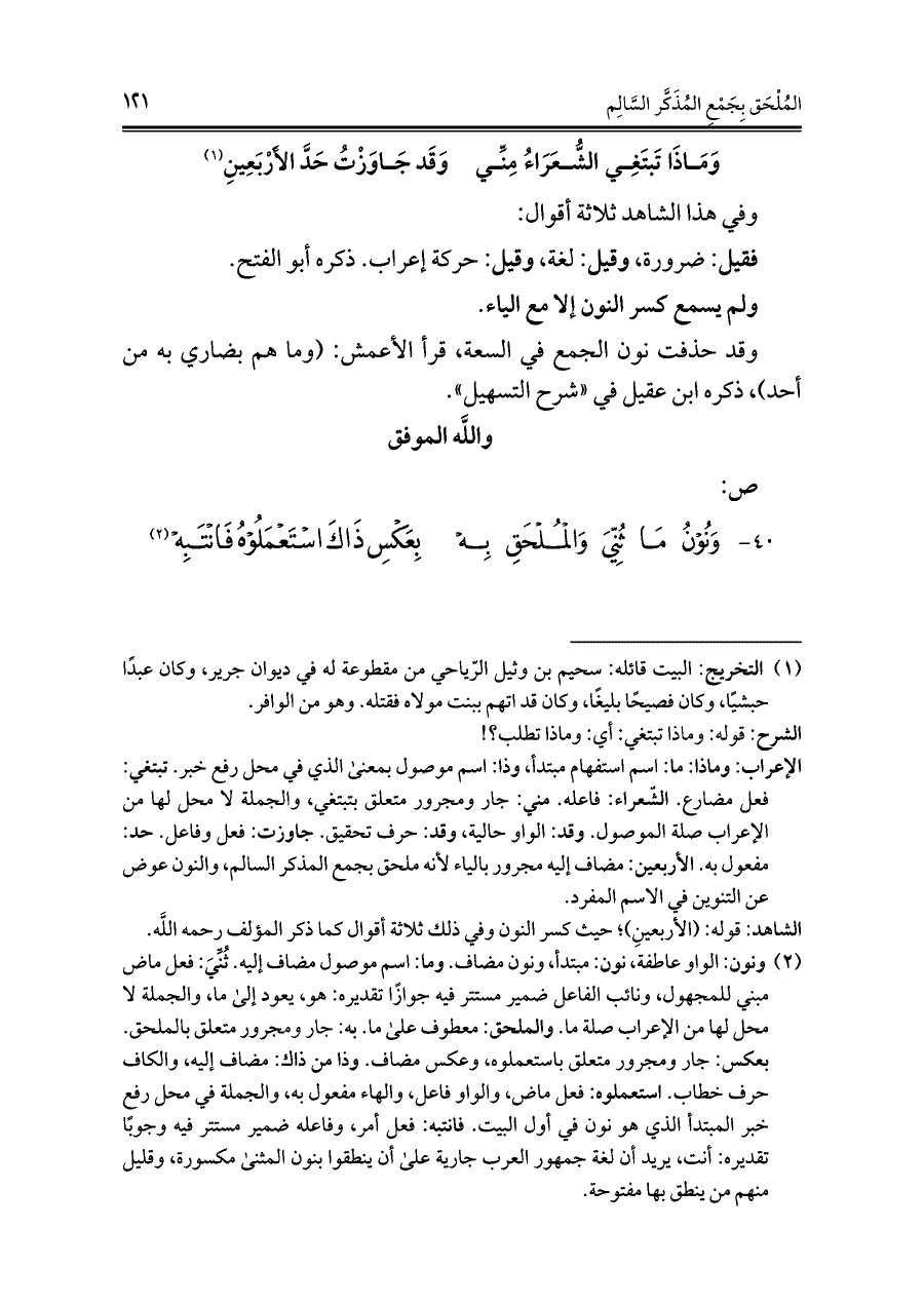 الشاهد: قوله: (الأربعينِ)؛ حيث كسر النون وفي ذلك ثلاثة أقوال كما ذكر المؤلف رحمه اللَّه.