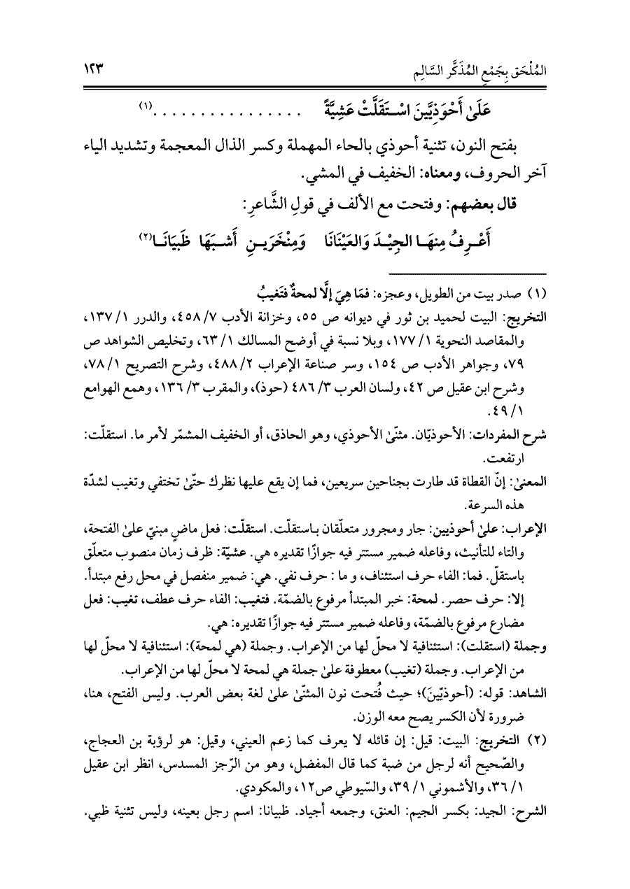 الشاهد: قوله: (أحوذيّينَ)؛ حيث فُتحت نون المثنّى على لغة بعض العرب. وليس الفتح، هنا، ضرورة لأن الكسر يصح معه الوزن.