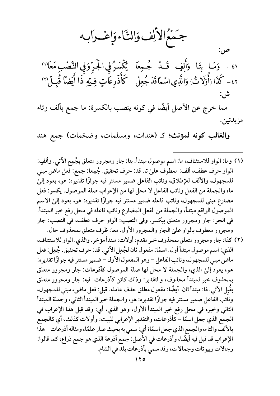 (¬١) وما: الواو للاستئناف؛ ما: اسم موصول مبتدأ. بتا: جار ومجرور متعلق بجُمِع الآتي. وألفٍ: الواو حرف عطف، ألف: معطوف على تا. قد: حرف تحقيق. جُمعا: جمع: فعل ماض مبني للمجهول، والألف للإطلاق، ونائب الفاعل ضمير مستتر فيه جوازًا تقديره: هو، يعود إلى ما، والجملة من الفعل ونائب الفاعل لا محلّ لها من الإعراب صلة الموصول. يكسر: فعل مضارع مبني للمجهول، ونائب فاعله ضمير مستتر فيه جوازًا تقديره: هو، يعود إلى الاسم الموصول الواقع مبتدأ، والجملة من الفعل المضارع ونائب فاعله في محلّ رفع خبر المبتدأ.