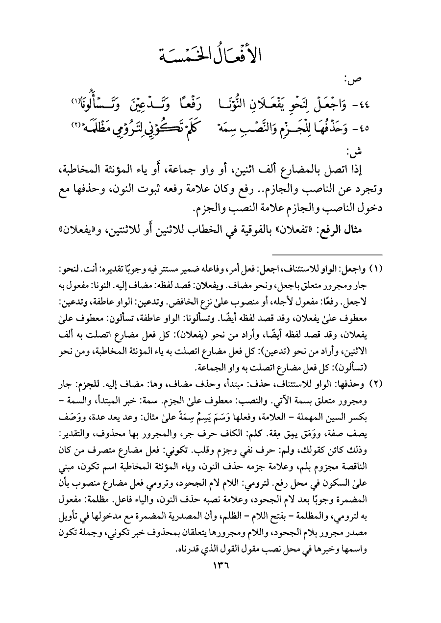 ٤٤ - واجْعَلْ لِنَحْوِ يَفْعَلَانِ النُّونَا ... رَفْعًا وَتَدْعِيْنَ وَتَسْأَلُونَا (¬١)