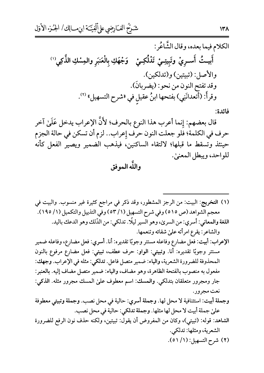 الإعراب: أبيت: فعل مضارع وفاعله مستتر وجوبًا تقديره: أنا. أسري: فعل مضارع، وفاعله ضمير مستتر وجوبًا تقديره: أنا. وتبيتي: الواو: حرف عطف، تبيتي: فعل مضارع مرفوع بالنون المحذوفة للضرورة الشعرية، والياء: ضمير متصل فاعل. تدلكي: مثله في الإعراب. وجهك: مفعول به منصوب بالفتحة الظاهرة، وهو مضاف، والياء: ضمير متصل مضاف إليه. بالعنبر: جار ومجرور متعلقان بتدلكي. والمسك: اسم معطوف على المسك مجرور مثله. الذكي: نعت مجرور.