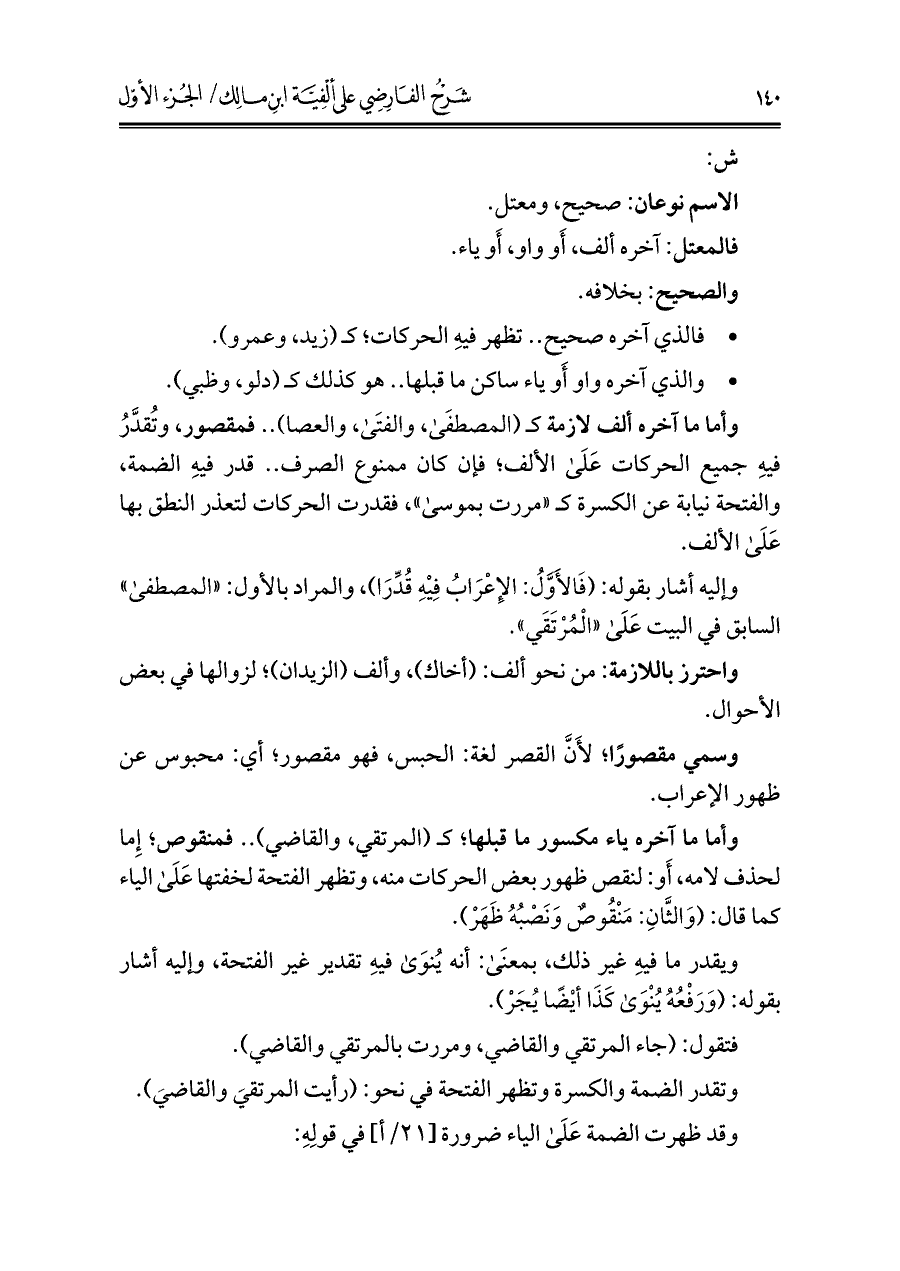 وأما ما آخره ياء مكسور ما قبلها؛ كـ (المرتقي، والقاضي) .. فمنقوص؛ إِما لحذف لامه، أَو: لنقص ظهور بعض الحركات منه، وتظهر الفتحة لخفتها عَلَى الياء كما قال: (وَالثَّانِ: مَنْقُوصٌ وَنَصْبُهُ ظَهْرَ).