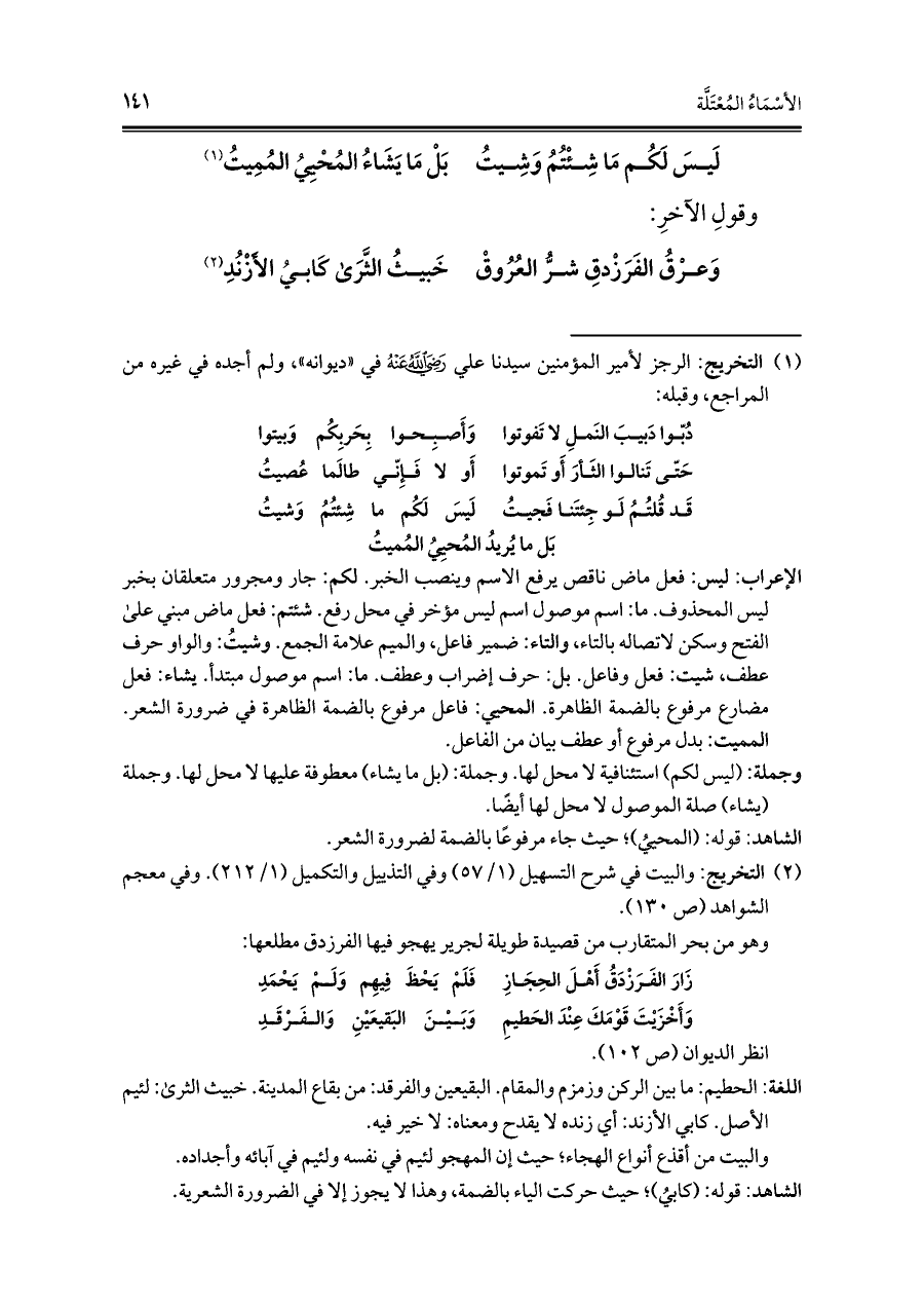 الإعراب: ليس: فعل ماض ناقص يرفع الاسم وينصب الخبر. لكم: جار ومجرور متعلقان بخبر ليس المحذوف. ما: اسم موصول اسم ليس مؤخر في محلّ رفع. شئتم: فعل ماض مبني على الفتح وسكن لاتصاله بالتاء، والتاء: ضمير فاعل، والميم علامة الجمع. وشيتُ: والواو حرف عطف، شيت: فعل وفاعل. بل: حرف إضراب وعطف. ما: اسم موصول مبتدأ. يشاء: فعل مضارع مرفوع بالضمة الظاهرة. المحيي: فاعل مرفوع بالضمة الظاهرة في ضرورة الشعر.