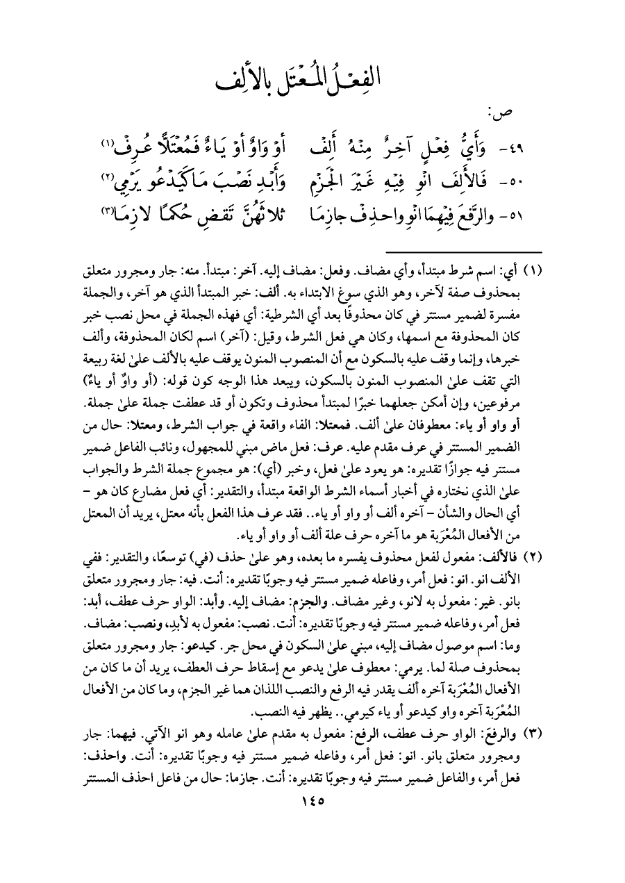 ٤٩ - وَأَيُّ فِعْلٍ آخِرٌ مِنْهُ أَلِفْ ... أوْ وَاوٌ أوْ يَاءٌ فَمُعْتَلًّا عُرِفْ (¬١)