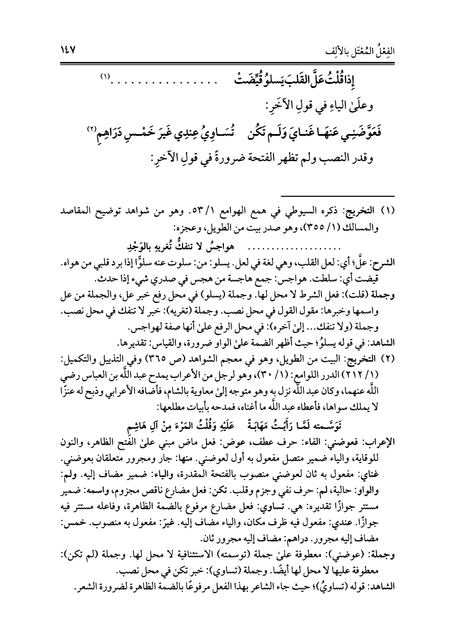 (¬١) التخريج: ذكره السيوطي في همع الهوامع ١/ ٥٣. وهو من شواهد توضيح المقاصد والمسالك (١/ ٣٥٥)، وهو صدر بيت من الطويل، وعجزه: