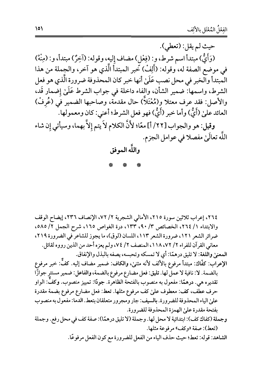 (وَأَيُّ) مبتدأ اسم شرط، و: (فِعْلٍ) مضاف إِليه، وقوله: (آخِرٌ) مبتدأ، و: (مِنْهُ) في موضع الصفة له، وقوله: (أَلِفْ) خبر المبتدأ الَّذي هو آخر، والجملة من هذا المبتدأ والخبر في محل نصب عَلَى أنها خبر كان المحذوفة ضرورة الَّذي هو فعل الشرط، واسمها: ضمير الشأن، والفاء داخلة في جواب الشرط عَلَى إِضمار قَد، والأصل: فقد عرف معتلا و (مُعْتَلًّا) حال مقدمة، وصاحبها الضمير في (عُرِفْ) العائد على (أَيُّ) وأما خبر (أَيُّ)، فهو فعل الشرط؛ أعني: كان ومعمولها.