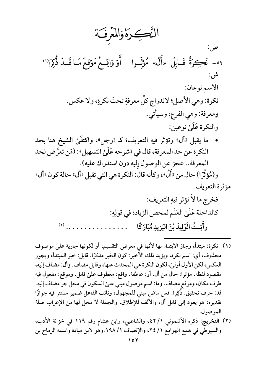 ٥٢ - نَكِرَةٌ قَابِلُ "أَلْ"، مُؤثِّوا ... أَوْ وَاقِع مَوْقِعَ مَا قَدْ ذُكِرَا (¬١)