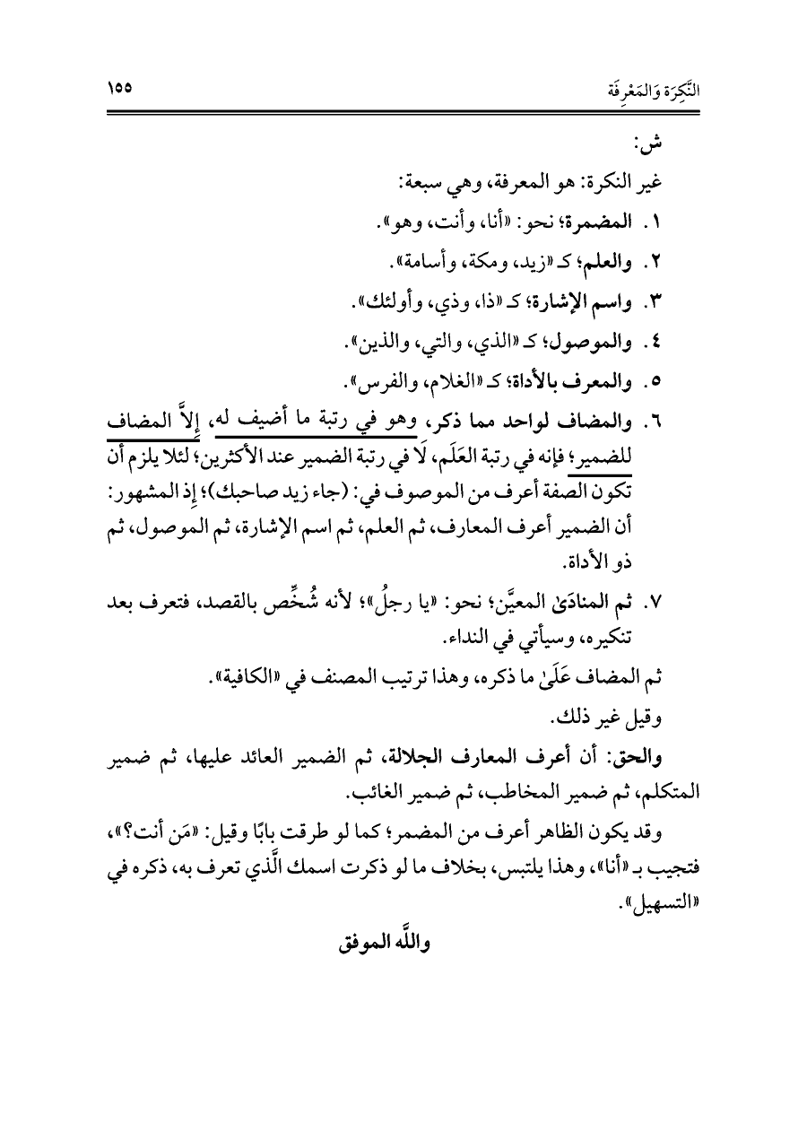 ٦ - والمضاف لواحد مما ذكر، وهو في رتبة ما أضيف له، إِلَّا المضاف للضمير؛ فإنه في رتبة العَلَم، لَا في رتبة الضمير عند الأكثرين؛ لئلا يلزم أن تكون الصفة أعرف من الموصوف في: (جاء زيد صاحبك)؛ إِذ المشهور: أن الضمير أعرف المعارف، ثم العلم، ثم اسم الإشارة، ثم الموصول، ثم ذو الأداة.