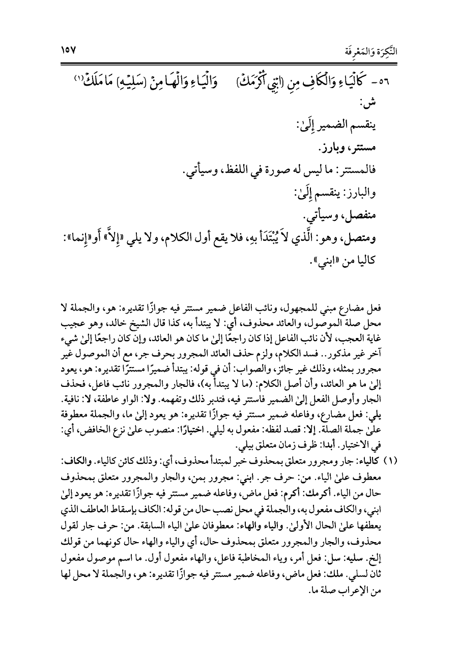 ٥٦ - كَالْيَاءِ وَالْكَافِ مِنِ (ابْنِي أكْرَمَكْ) ... وَالْيَاءِ وَالْهَا مِنْ (سَلِيْه) مَا مَلَكْ (¬١)