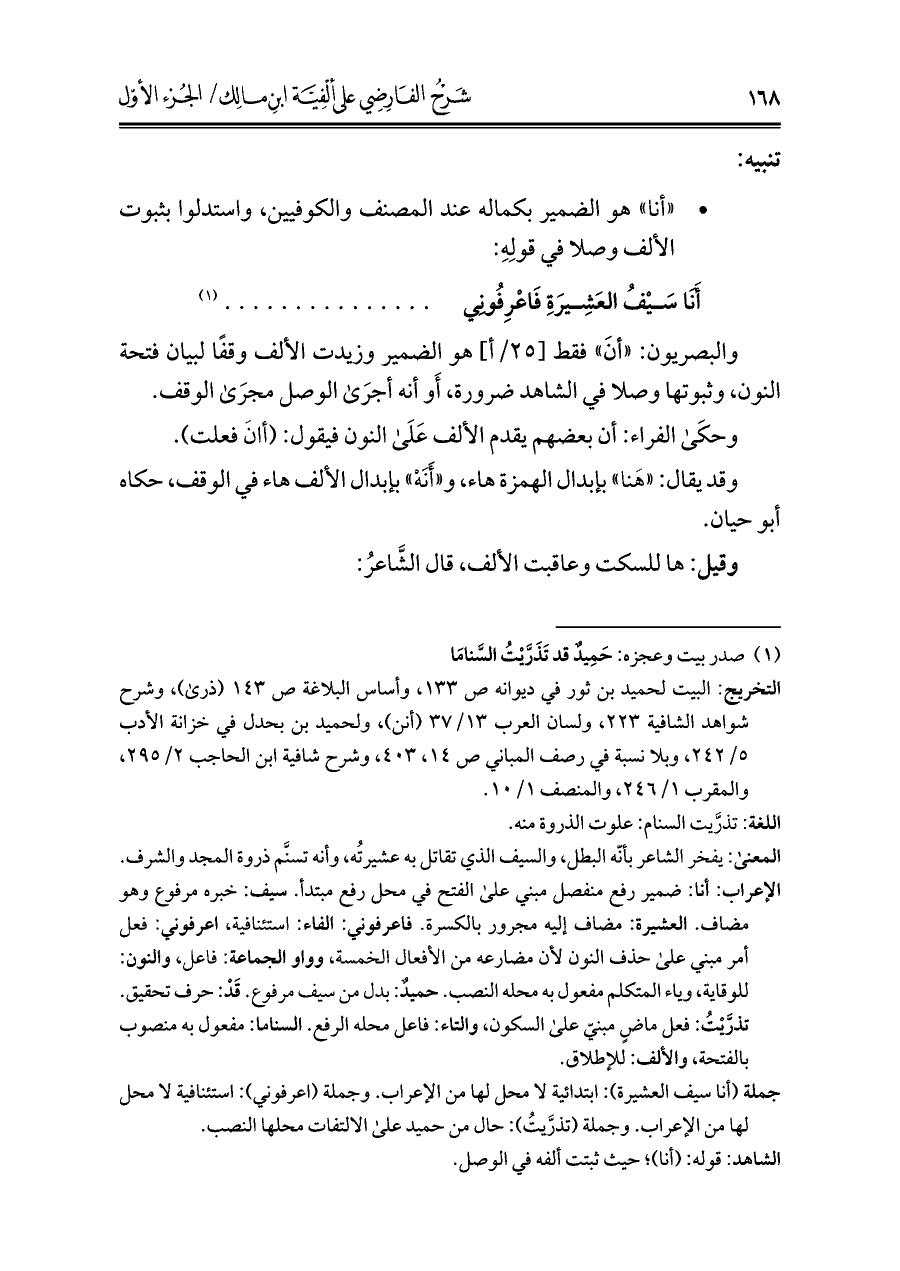 الإعراب: أنا: ضمير رفع منفصل مبني على الفتح في محل رفع مبتدأ. سيف: خبره مرفوع وهو مضاف. العشيرة: مضاف إليه مجرور بالكسرة. فاعرفوني: الفاء: استئنافية؛ اعرفوني: فعل أمر مبني على حذف النون لأن مضارعه من الأفعال الخمسة، وواو الجماعة: فاعل، والنون: للوقاية، وياء المتكلم مفعول به محله النصب. حميدٌ؛ بدل من سيف مرفوع. قَدْ: حرف تحقيق. تذرَّيْتُ: فعل ماضٍ مبنيّ على السكون، والتاء: فاعل محله الرفع. السناما: مفعول به منصوب بالفتحة، والألف: للإطلاق.