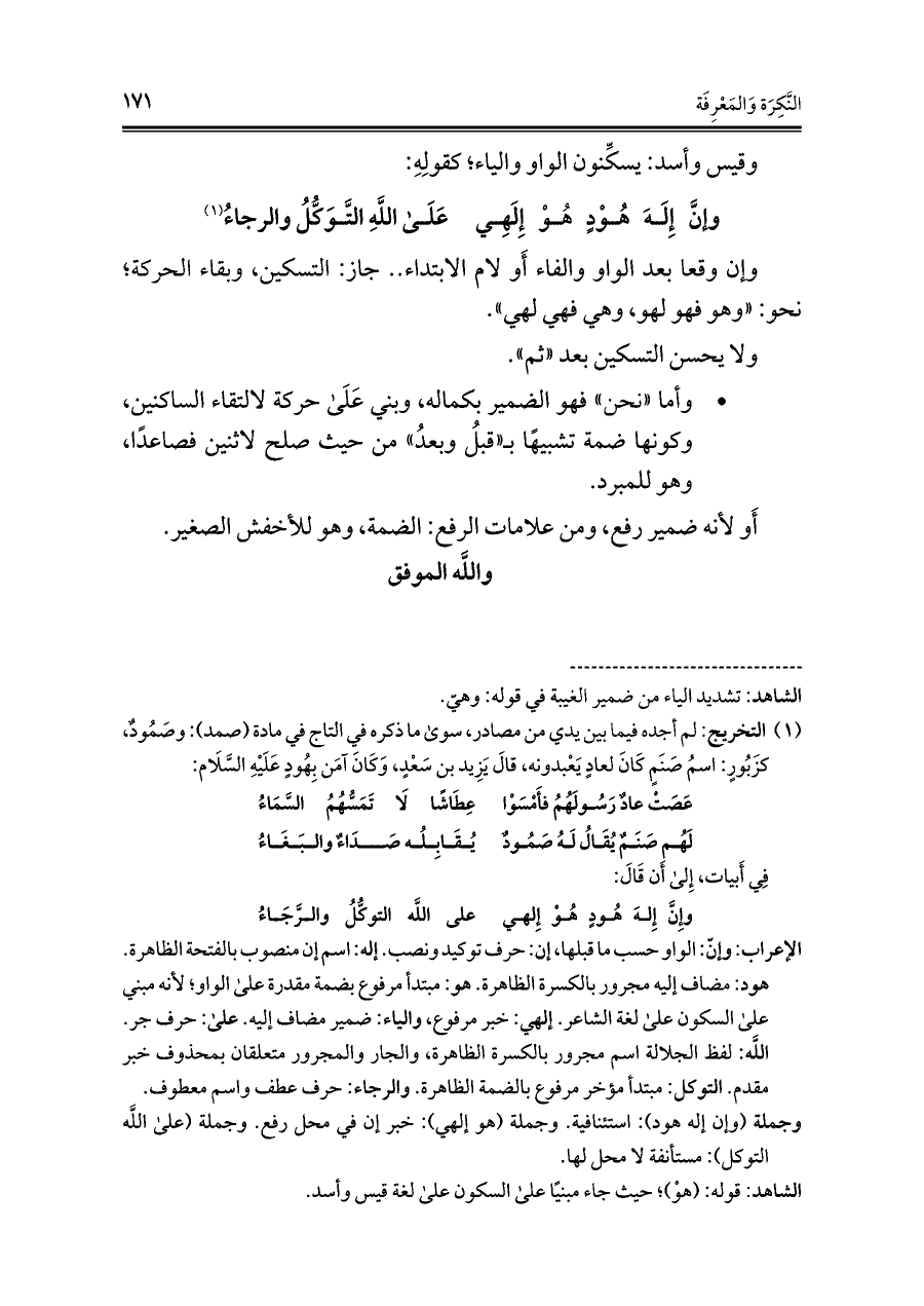 الشاهد: تشديد الياء من ضمير الغيبة في قوله: وهيّ.