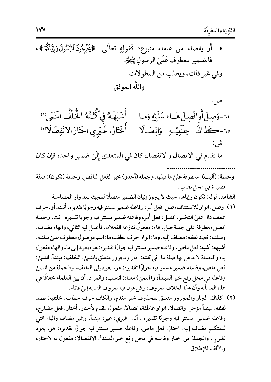 (¬١) وصل: الواو للاستئناف؛ صل: فعل أمر، وفاعله ضمير مستتر فيه وجوبًا تقديره: أنت. أو: حرف عطف دال على التخيير. افصل: فعل أمر، وفاعله ضمير مستتر فيه وجوبًا تقديره: أنت، وجملة افصل معطوفة على جملة صل. هاء: مفعولٌ تنازعه الفعلان، فأعمل فيه الثاني، والهاء مضاف. وسلنيه: قصد لفظه: مضاف إليه. وما: الواو حرف عطف، ما: اسم موصول معطوف على سلنيه. أشبهه: أشبه: فعل ماض، وفاعله ضمير مستتر فيه جوازًا تقديره: هو، يعود إلى ما، والهاء مفعول به، والجملة لا محل لها صلة ما. في كنته: جار ومجرور متعلق بانتمى. الخلف: مبتدأ. انتمى: فعل ماض، وفاعله ضمير مستتر فيه جوازًا تقديره: هو، يعود إلى الخلف، والجملة من انتمى وفاعله في محل رفع خبر المبتدأ، و (انتمى) معناه: انتسب، والمراد: أن بين العلماء خلافًا في هذه المسألة وأن هذا الخلاف معروف، وكل قول فيه معروف النسبة إلى قائله.