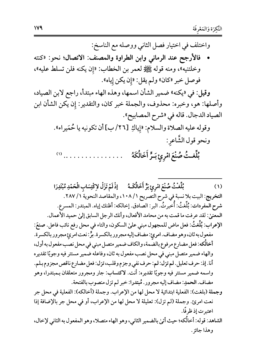 * فالأرجح عند الرماني وابن الطراوة والمصنف: الاتصال؛ نحو: "كنته وخلتنيه"، ومنه قوله -صلى الله عليه وسلم- لعمر بن الخطاب: "إِن يكنه فلن تسلط عليه"، فوصل خبر "كان" ولم يقل: "إِن يكن إِياه".