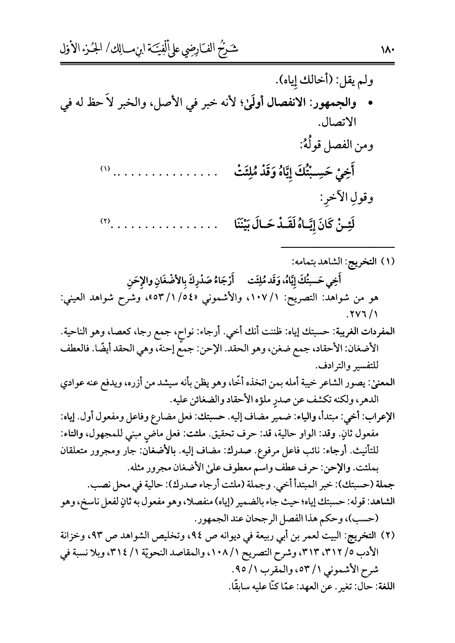 الشاهد: قوله: حسبتك إياه؛ حيث جاء بالضمير (إياه) منفصلا، وهو مفعول به ثانٍ لفعل ناسخ، وهو (حسب)، وحكم هذا الفصل الرجحان عند الجمهور.
