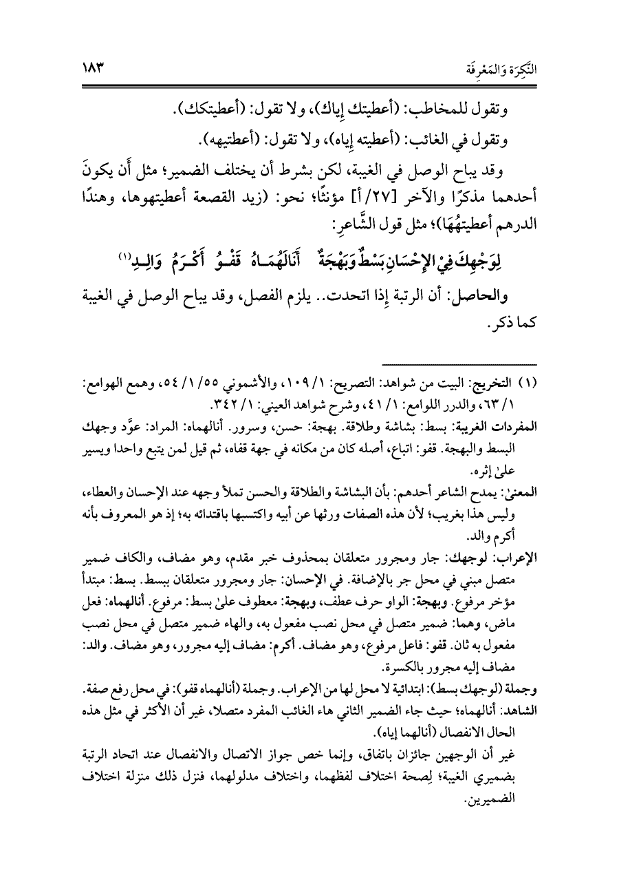الإعراب: لوجهك: جار ومجرور متعلقان بمحذوف خبر مقدم، وهو مضاف، والكاف ضمير متصل مبني في محل جر بالإضافة. في الإحسان: جار ومجرور متعلقان ببسط. بسط: مبتدأ مؤخر مرفوع. وبهجة: الواو حرف عطف، وبهجة: معطوف على بسط: مرفوع. أنالهماه: فعل ماض، وهما: ضمير متصل في محل نصب مفعول به، والهاء ضمير متصل في محل نصب مفعول به ثان. قفو: فاعل مرفوع، وهو مضاف. أكرم: مضاف إليه مجرور، وهو مضاف. والد: مضاف إليه مجرور بالكسرة.