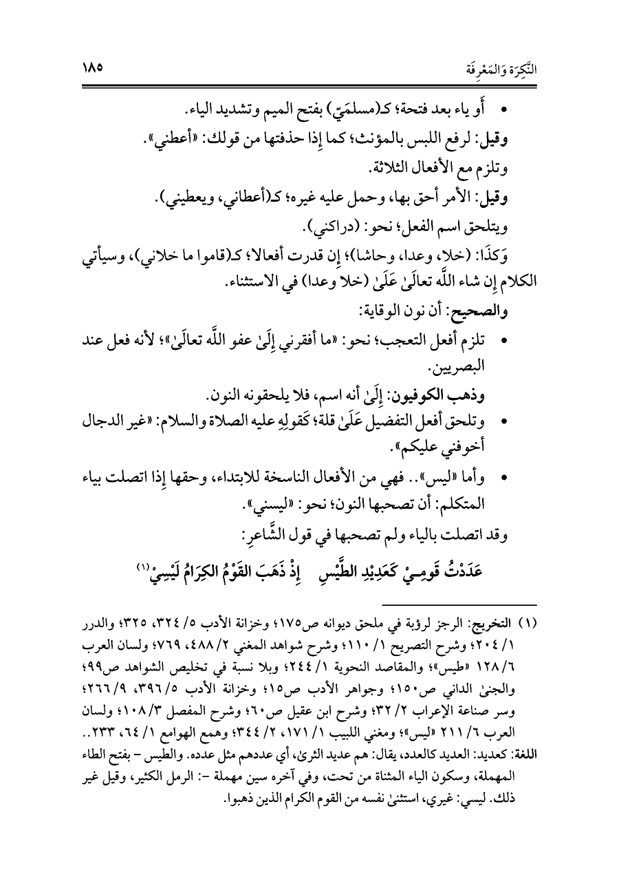 * وأما "ليس" .. فهي من الأفعال الناسخة للابتداء، وحقها إِذا اتصلت بياء المتكلم: أن تصحبها النون؛ نحو: "ليسني".