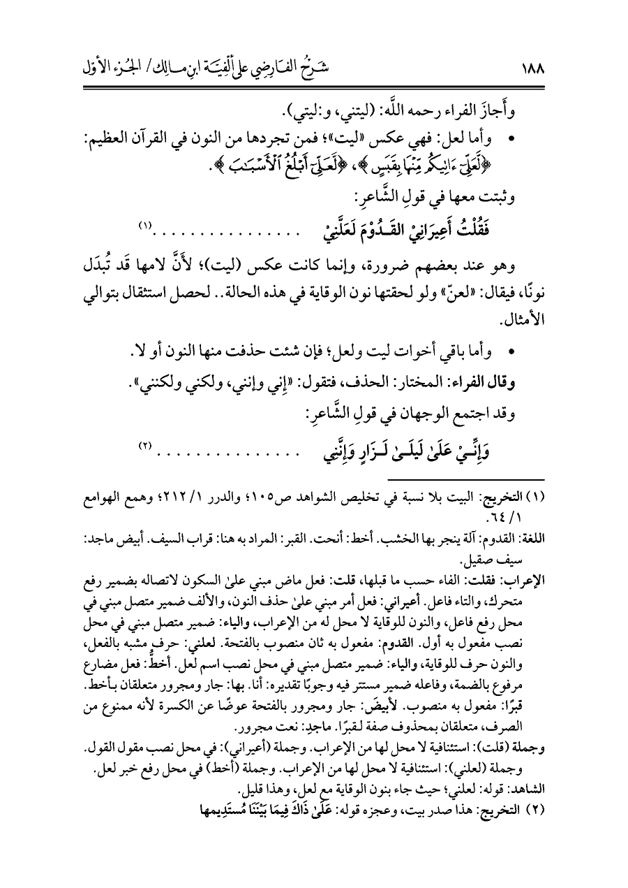 وهو عند بعضهم ضرورة، وإنما كانت عكس (ليت)؛ لأَنَّ لامها قَد تُبدَل نونًا، فيقال: "لعنّ" ولو لحقتها نون الوقاية في هذه الحالة .. لحصل استثقال بتوالي الأمثال.